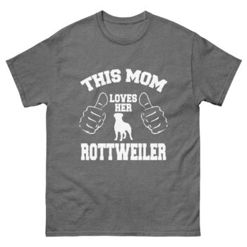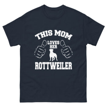 This “This Mom Loves Her Rottweiler” t-shirt is the perfect way for dog moms to show off their love for their loyal and protective companion. With two thumbs-up graphics and a bold Rottweiler silhouette, this tee makes a powerful and affectionate statement.