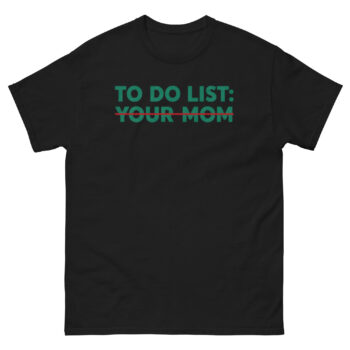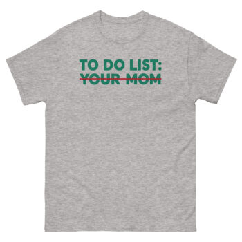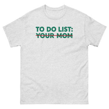 If you’re looking for a shirt that’s equal parts shocking and hilarious, the To Do List: Your Mom Shirt – Savage Funny Humor Tee delivers unapologetic punch. This checklist humor t-shirt turns a classic joke into a visual gag that’s impossible to ignore. With bold colors, clean layout, and a strikethrough that says it all, this tee is best choice for prank lovers, meme fans, and anyone who enjoys a little chaos in their wardrobe.