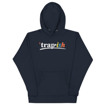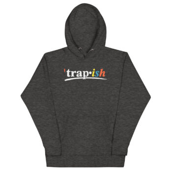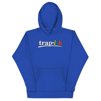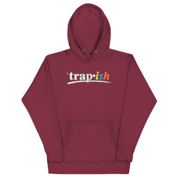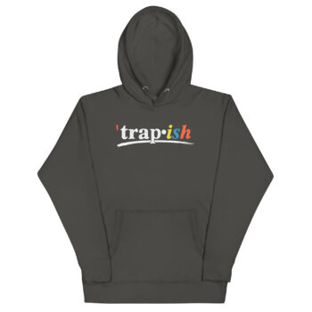 The word “’trap” hits hard in bold white letters, with a red apostrophe that pops like a sudden ad-lib. Then, the “ish” flows out in a smooth, italicized gradient of yellow, green, and red. This isn’t just a random choice; it’s a visual nod to the global roots of rhythm, from Afrobeat to Dancehall, that have fused with trap’s iconic sound. This makes the hoodie a true lyrical statement hoodie without saying a single word. It’s a minimalist masterpiece for those who understand that style is in the nuance.