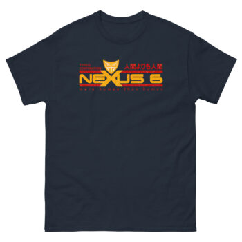 The shirt features a bold “NEXUS 6” wordmark in gradient orange-red, anchored by a stylized yellow owl—symbolizing wisdom, surveillance, and artificial intelligence. Japanese text adds a layer of global futurism, reflecting Blade Runner’s multicultural dystopia. Together, these elements create a vintage sci fi design t shirt that’s rich in meaning and visual impact.