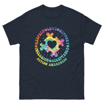 But why settle for ordinary when you can make an impact with style? Unlike generic awareness apparel, this puzzle piece heart awareness tee combines eye-catching design with a powerful message. The vibrant tie-dye autism support shirt features a striking puzzle heart, symbolizing unity, while the circular text—“Respect • Love • Support • Inclusion • Acceptance”—reinforces the values we champion.
