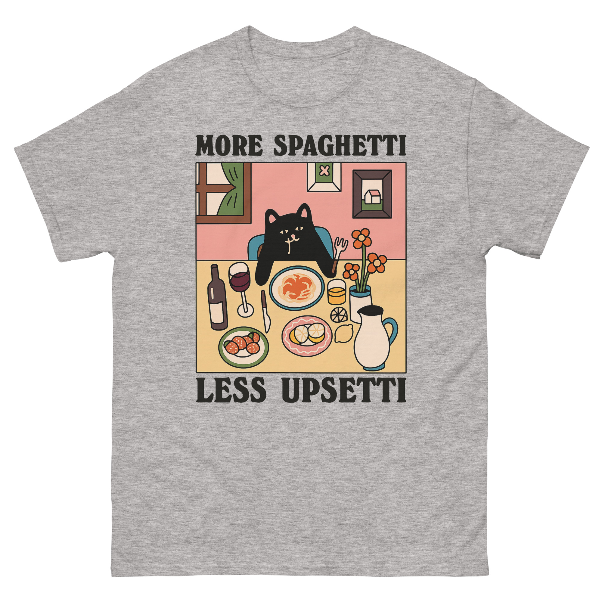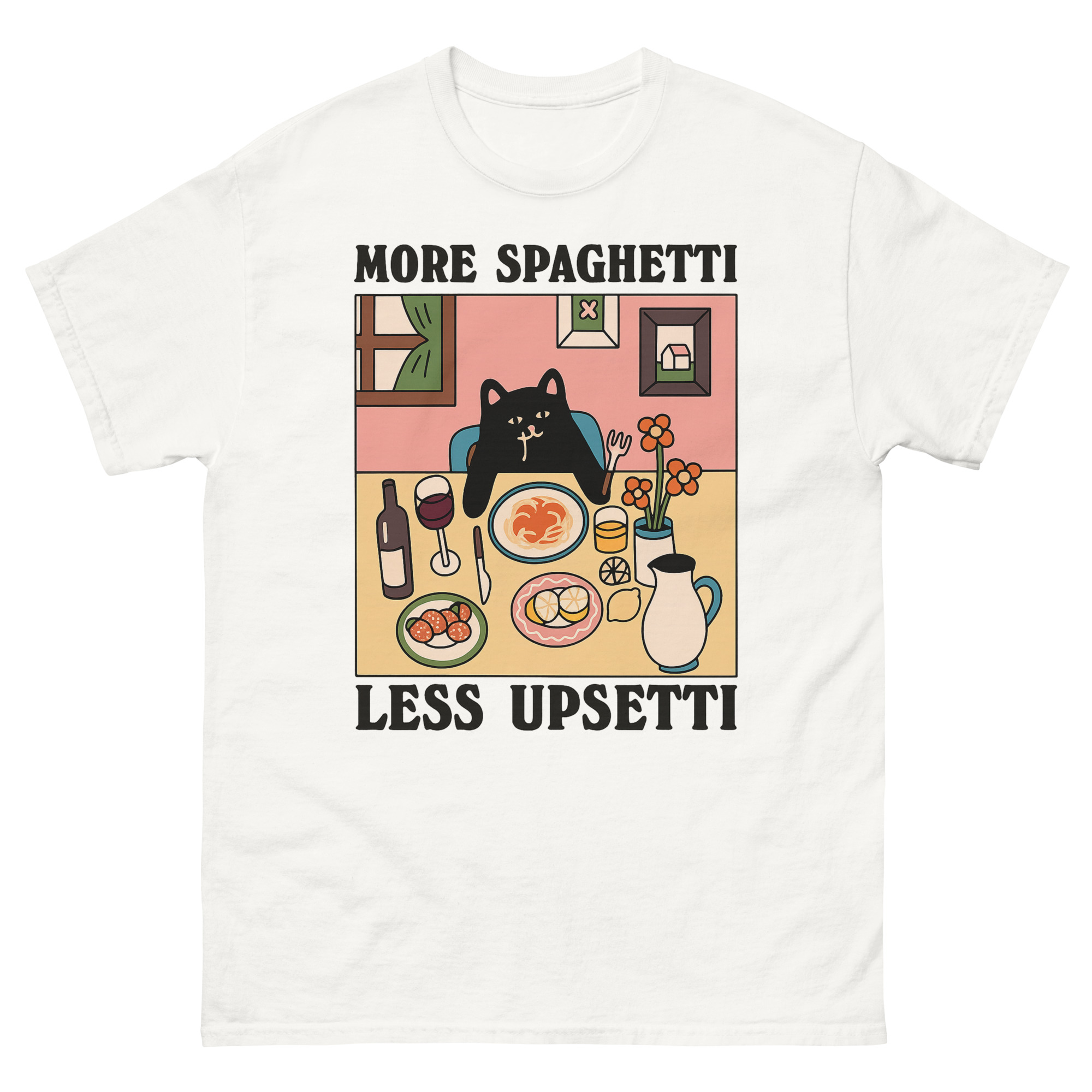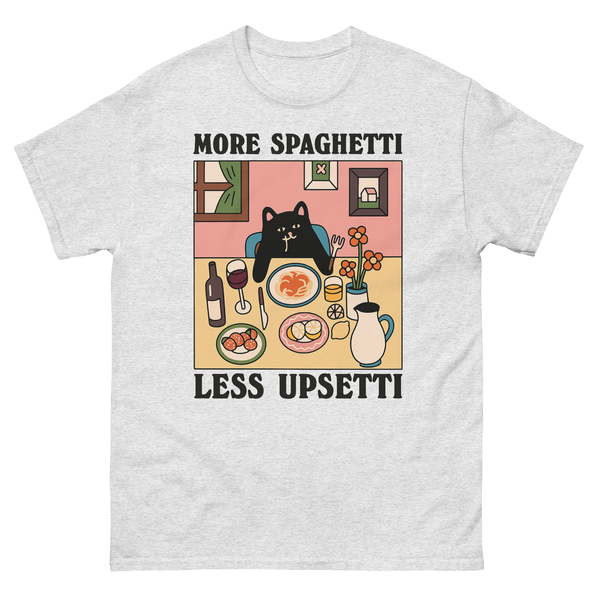 Upsetti Spaghetti T-Shirts – The Cute Black Cat & Comfort Food Graphic Tee