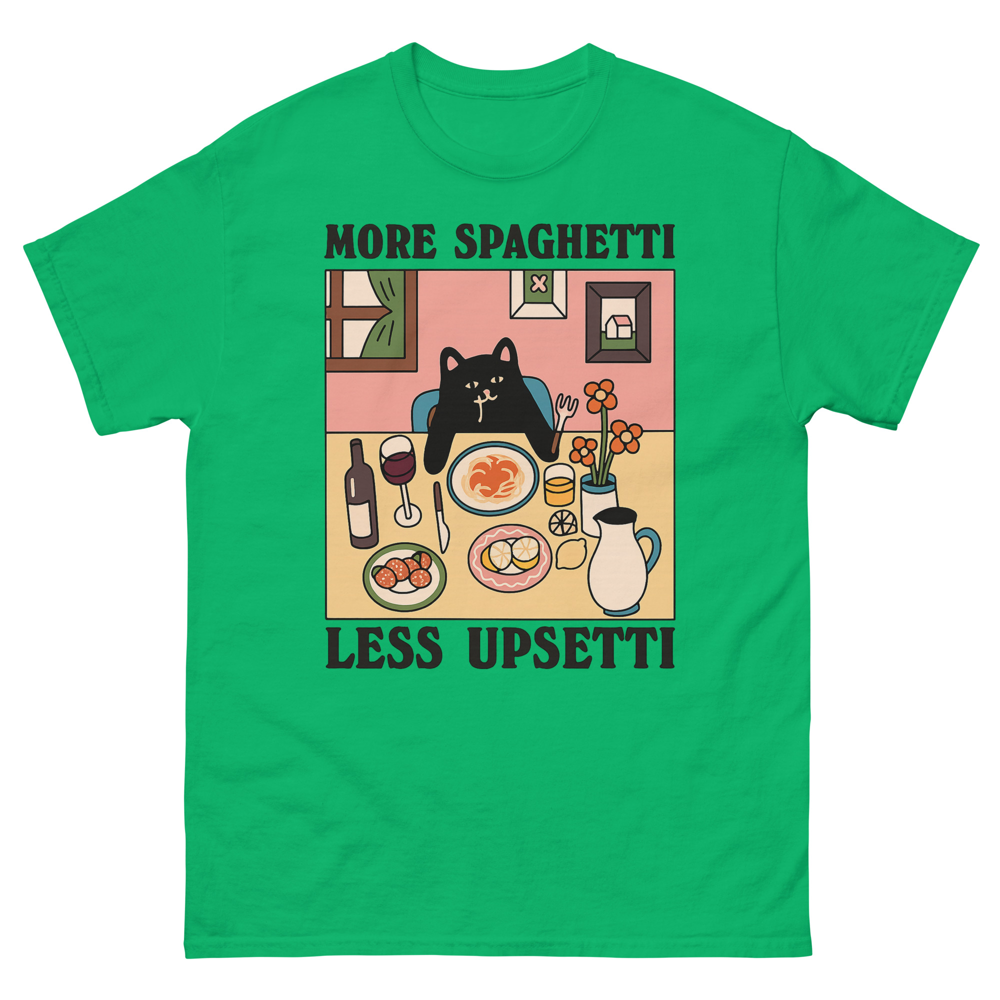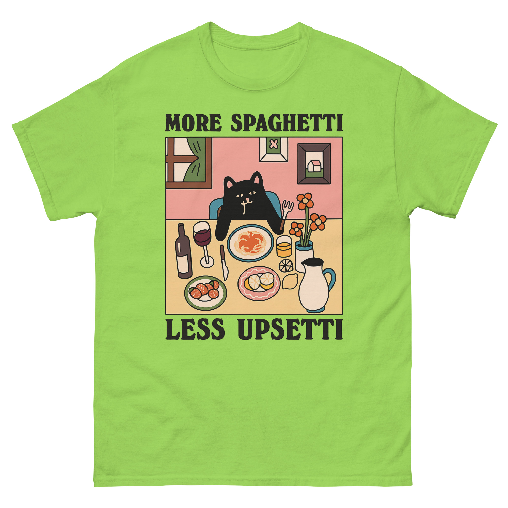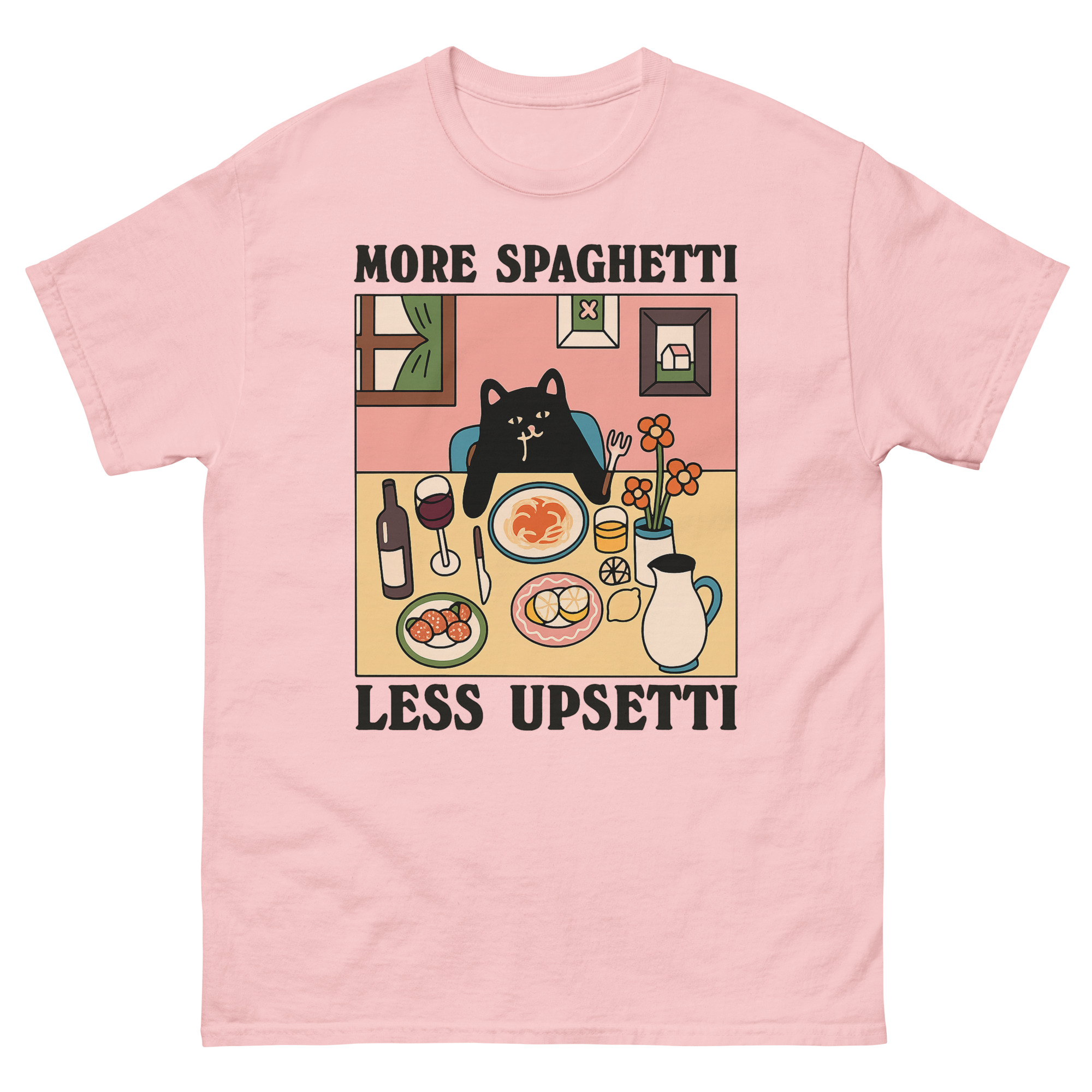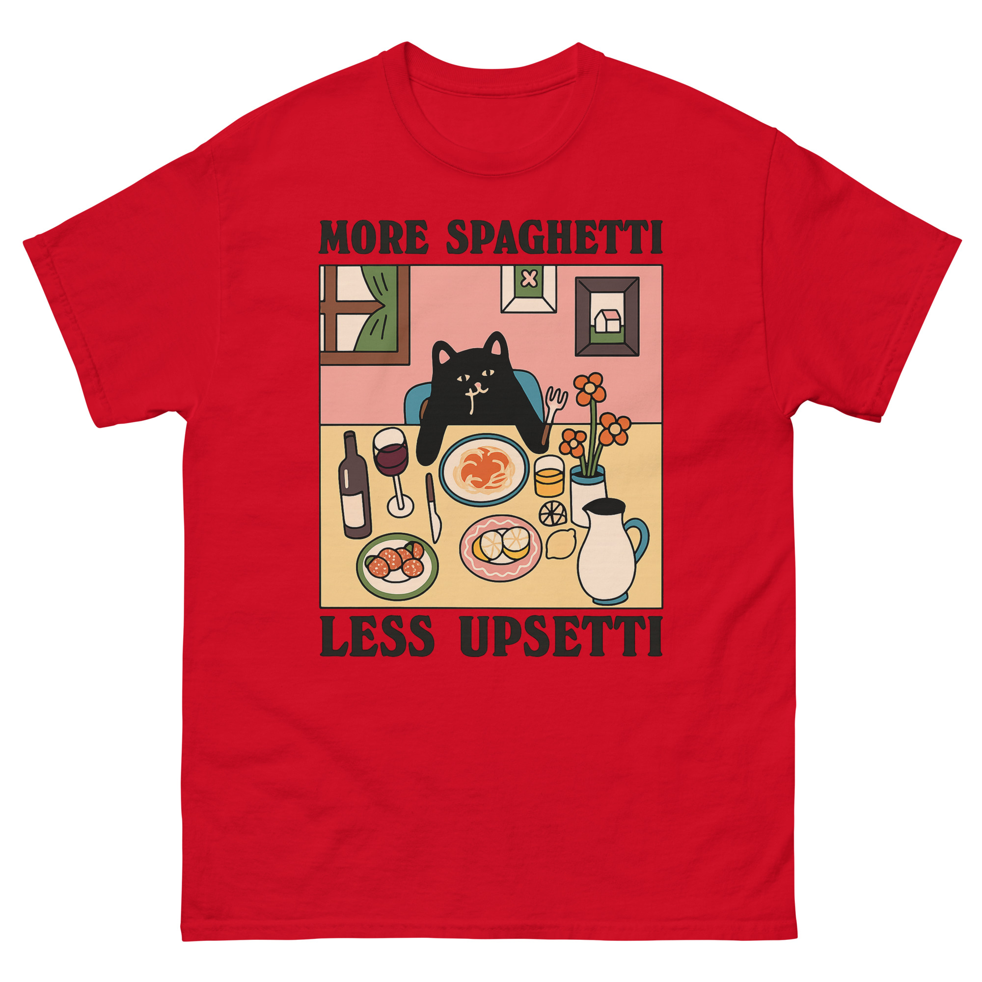 Upsetti Spaghetti T-Shirts – The Cute Black Cat & Comfort Food Graphic Tee