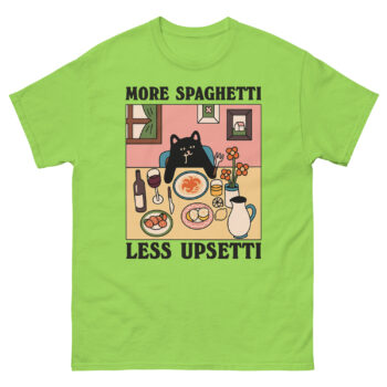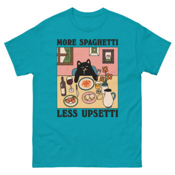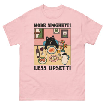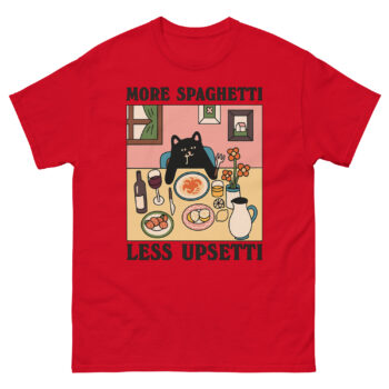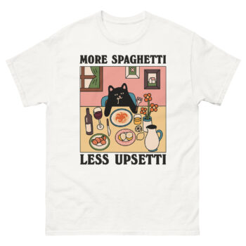 Have you ever had one of those days where only comfort food and a little humor will do? The Upsetti Spaghetti T-Shirts are designed for exactly that feeling. Featuring a charming, melancholy black cat at a cozy dinner table, this tee turns the playful internet mantra into a wearable hug. It’s more than just a funny graphic tee; it’s a gentle reminder for cat lovers and foodies alike that sometimes, the best solution is simply “more spaghetti, less upsetti.”