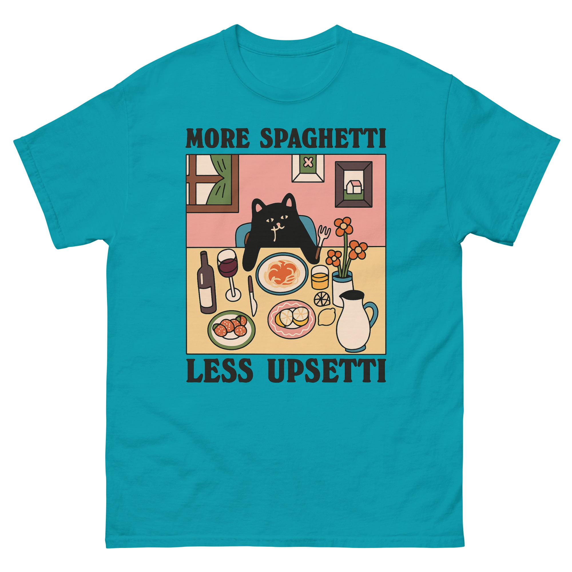 The scene is rich with storytelling. A cartoon black cat, with wide, thoughtful eyes, contemplates a plate of spaghetti in a quaint dining room. The table is set with delightful details, a glass of wine, meatballs, a pitcher, and a vase of flowers inviting you into its cozy world. Above and below, the bold, clear text delivers the emotional punchline: “MORE SPAGHETTI / LESS UPSETTI.” This isn’t just a print; it’s a narrative illustration that offers a moment of connection and a smile.