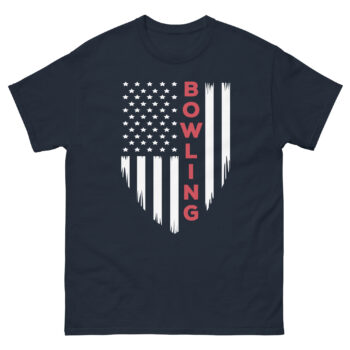 This shirt boldly blends your love for America and the lanes with a distressed U.S. flag design and vertical “BOWLING” text in standout red.