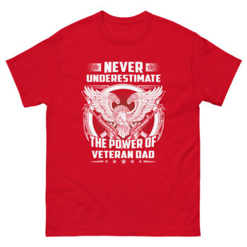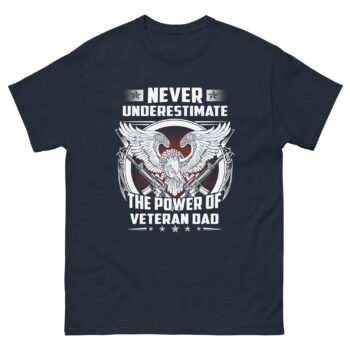 T-shirt featuring the bold statement: “Never Underestimate the Power of Veteran Dad” in striking block lettering. The design showcases a powerful eagle graphic with outstretched wings, crossed rifles, and a patriotic circular background, symbolizing strength, honor, and service.