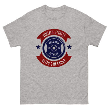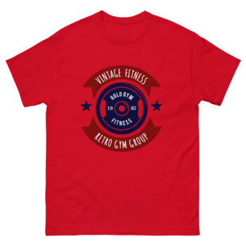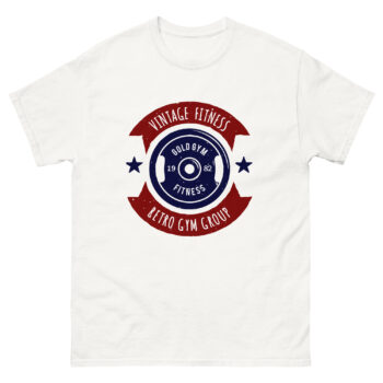 The Vintage Fitness – Retro Gym Group t-shirt is perfect for fans of classic bodybuilding and timeless strength culture. Featuring a navy weight plate with the words “Gold Gym Fitness – 1982,” surrounded by bold red banners reading “Vintage Fitness” and “Retro Gym Group,” this shirt is a nostalgic nod to the golden era of gyms. Ideal for lifters, gym-goers, and vintage sportswear collectors.