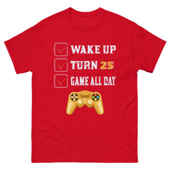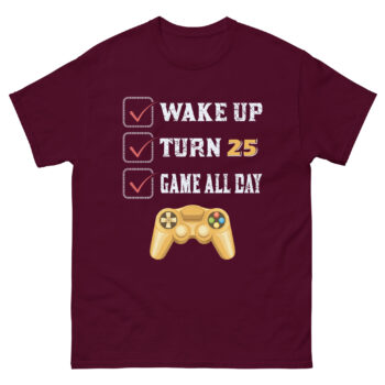 Turning 25 is a milestone worth celebrating – and what better way to do it than in true gamer style? This “Wake Up Turn 25 Game All Day” t-shirt is the ultimate gamer birthday checklist shirt, blending minimalist humor, gaming pride, and birthday vibes into one sleek design.