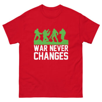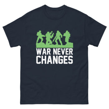 The four soldier figures aren’t just decorative—they represent the unchanging nature of conflict across generations. Paired with the stark “WAR NEVER CHANGES” text, this War Never Changes gaming quote tee hits harder than a headshot.