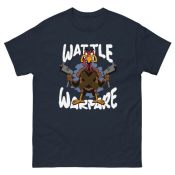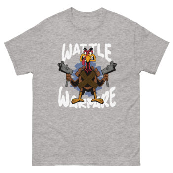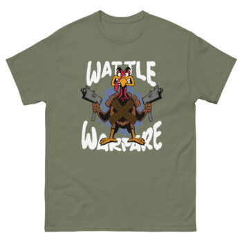 Get ready for laughs this Thanksgiving with our edgy “Wattle Warfare” shirt. Featuring a cartoon turkey locked and loaded, this dark humor tee is perfect for anyone who loves offensive jokes and unique holiday fashion. A bold gift idea for friends and family with a wicked sense of humor.