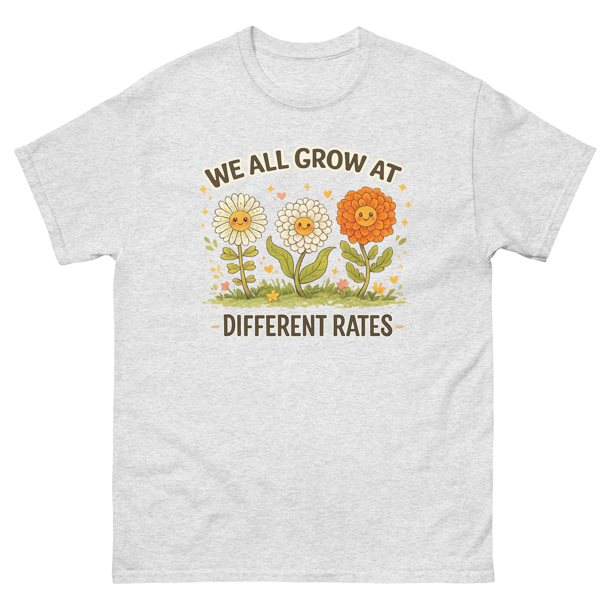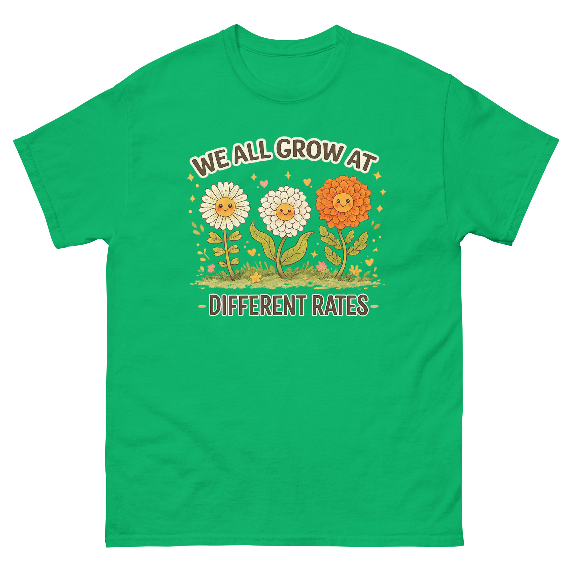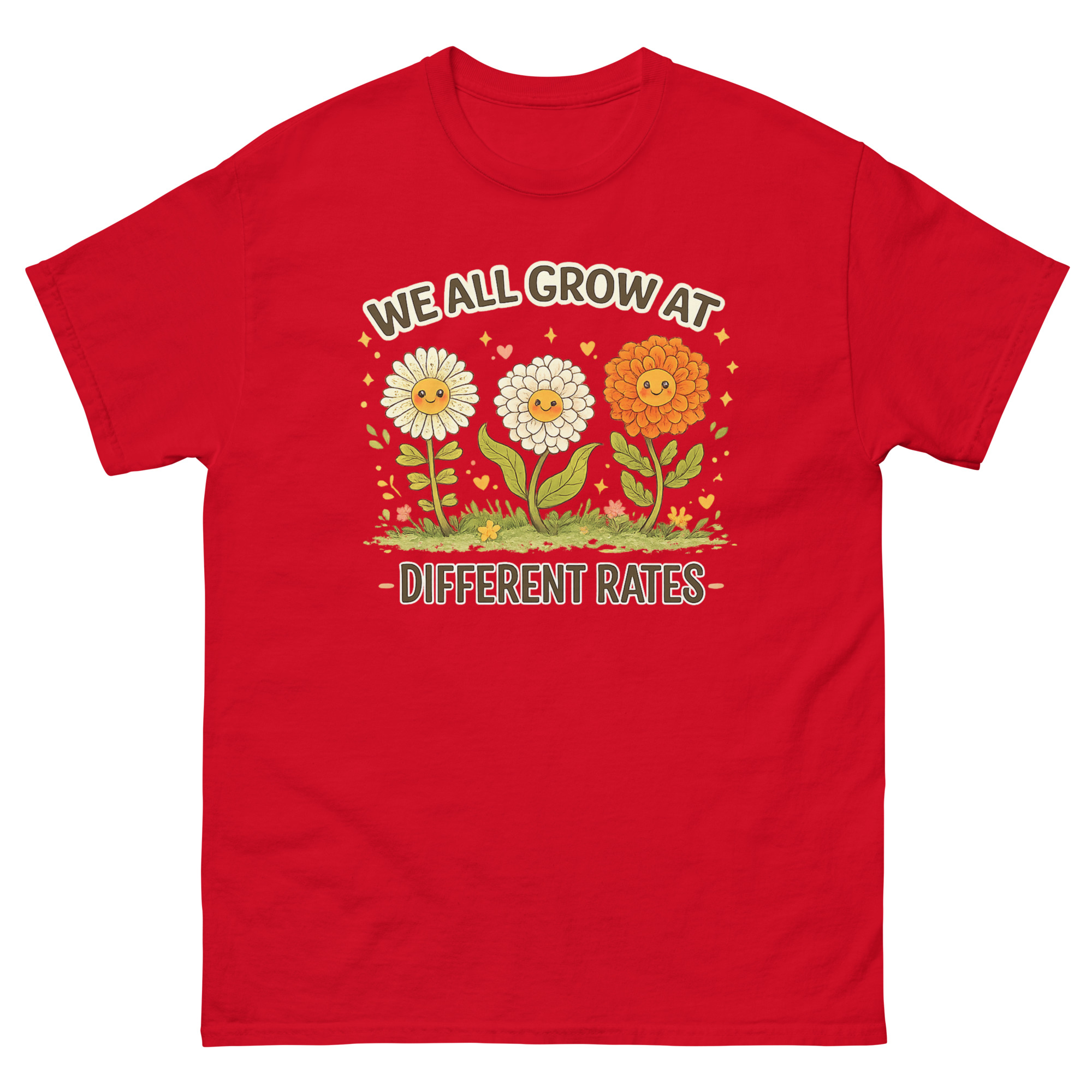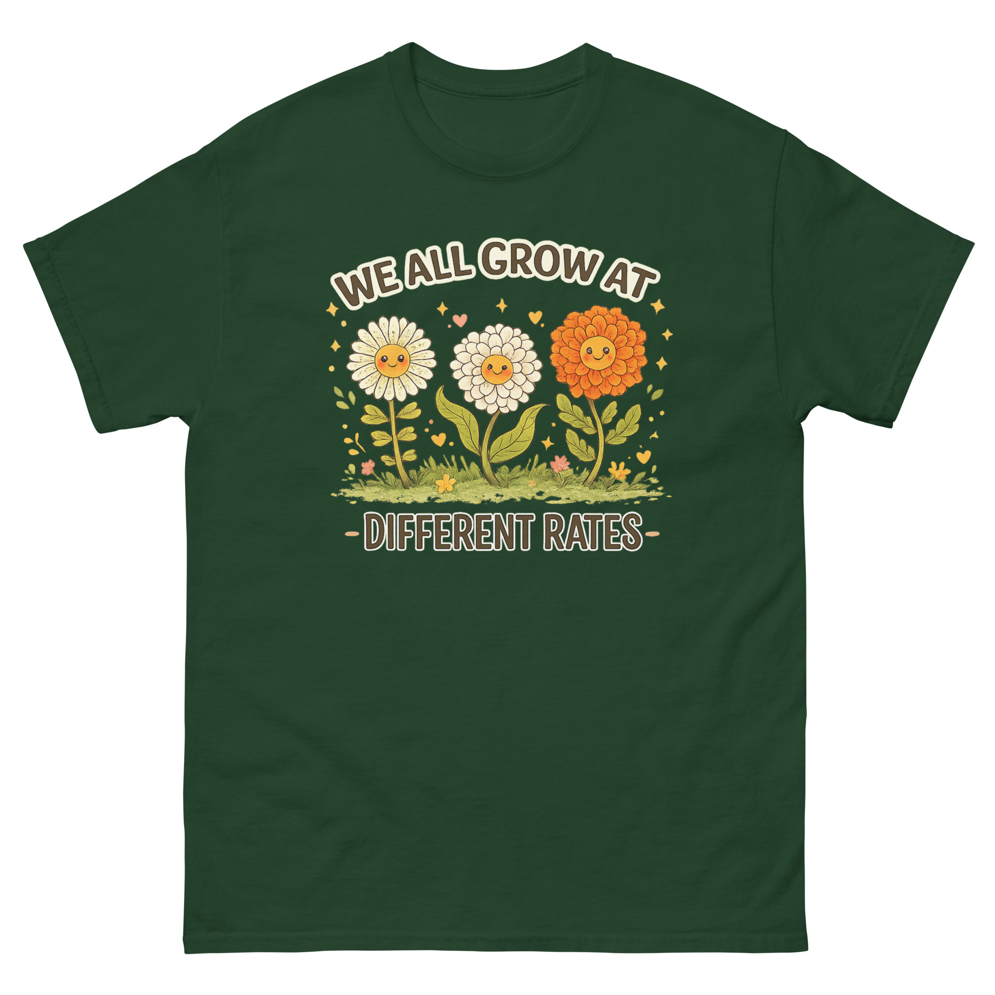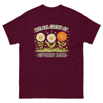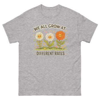 We All Grow At Different Rates Shirt design was born from a simple observation in a real garden. Some flowers burst open in spring sunshine, while others wait patiently for autumn’s cooler days. Neither is late; they simply follow their own rhythm. Human development works the same way! Sadly, our culture often prizes only the early bloomers. This shirt, therefore, is our argument against that pressure. It’s a declaration for radical patience, making it ideal growth mindset teacher apparel and a supportive encouragement gift for students who feel “behind.”