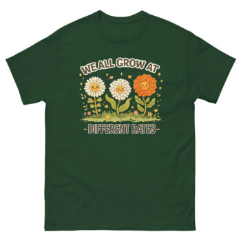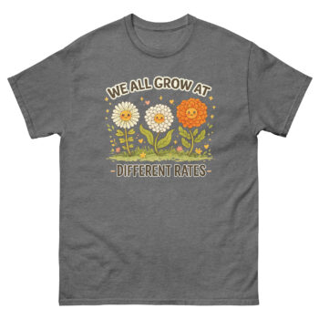 Remember that every expert was once a beginner; don’t compare your start to their finish. Instead, choose to wear a message that celebrates every step of the journey. The “We All Grow at Different Rates” shirt is a conversation starter, a comfort item, and a badge of compassionate understanding.