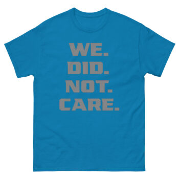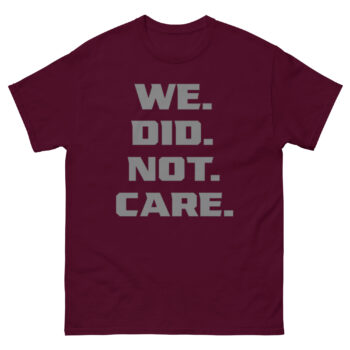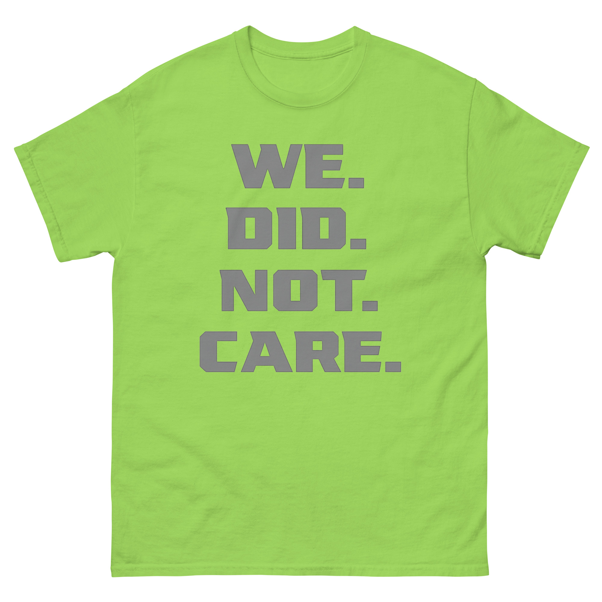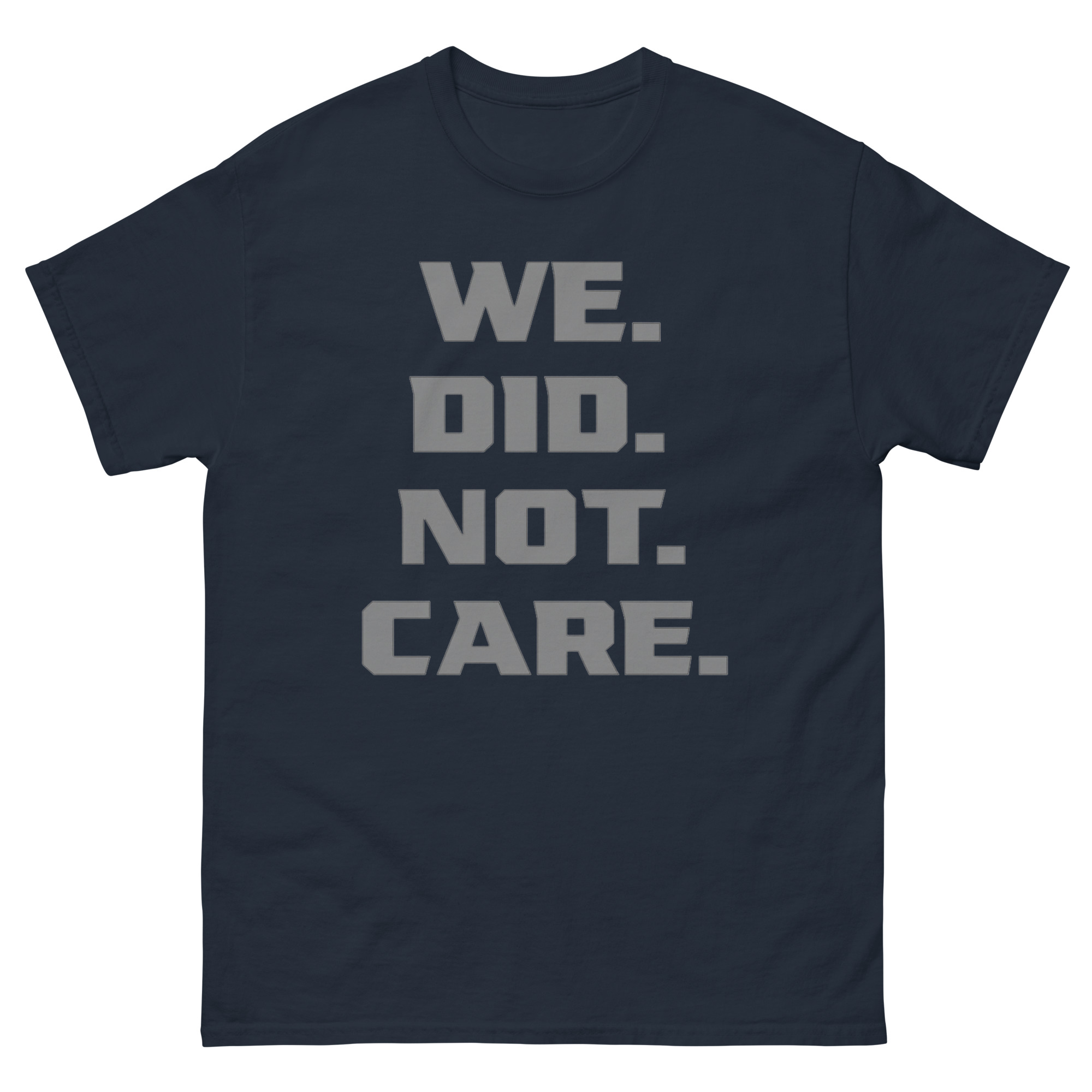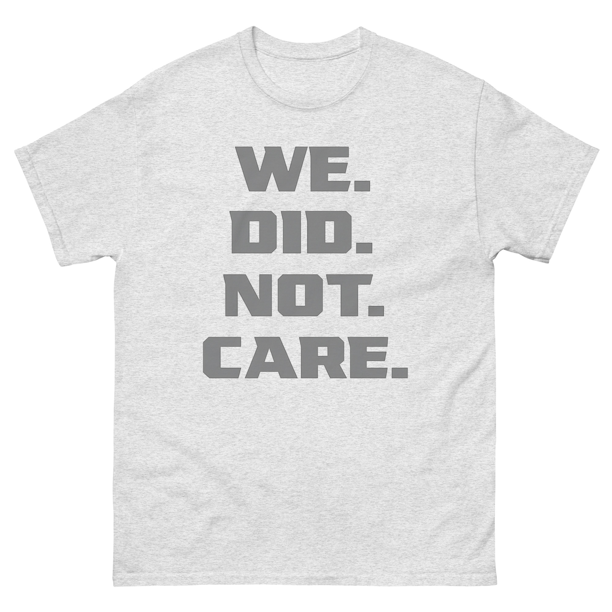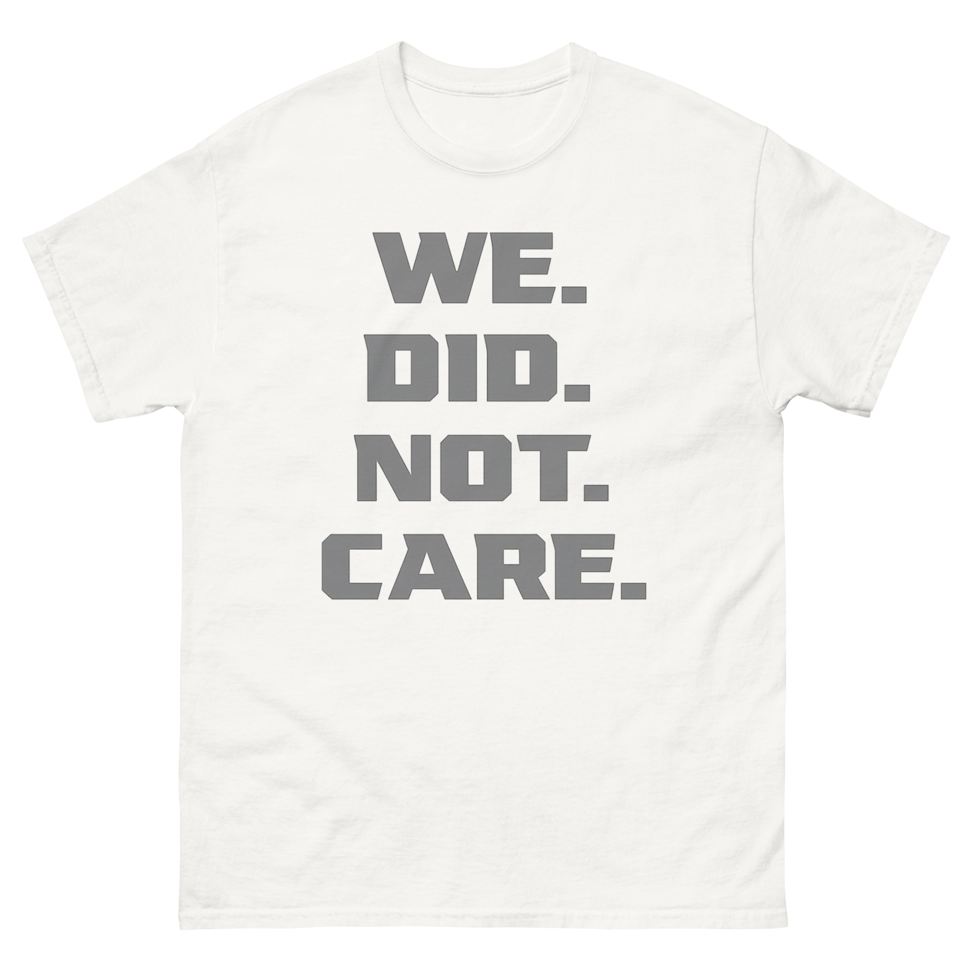 The design is all about impact through simplicity. The phrase “WE. DID. NOT. CARE.” is stacked in a strong, industrial font. Each word gets its own line and is followed by a large, square period, emphasizing that the matter is closed. This vertical text attitude tee uses minimalist typography to create a clear, uncompromising visual. There are no images or distractions, just the message itself. It’s a piece of cynical apparel for those who find strength in quiet resolve rather than loud argument.