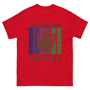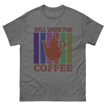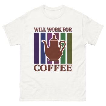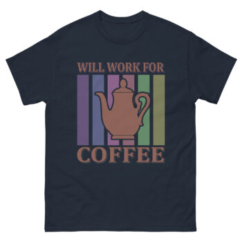 Show your dedication to caffeine with this funny “Will Work for Coffee” tee. A vintage-style shirt perfect for coffee lovers, baristas, or office humor fans.