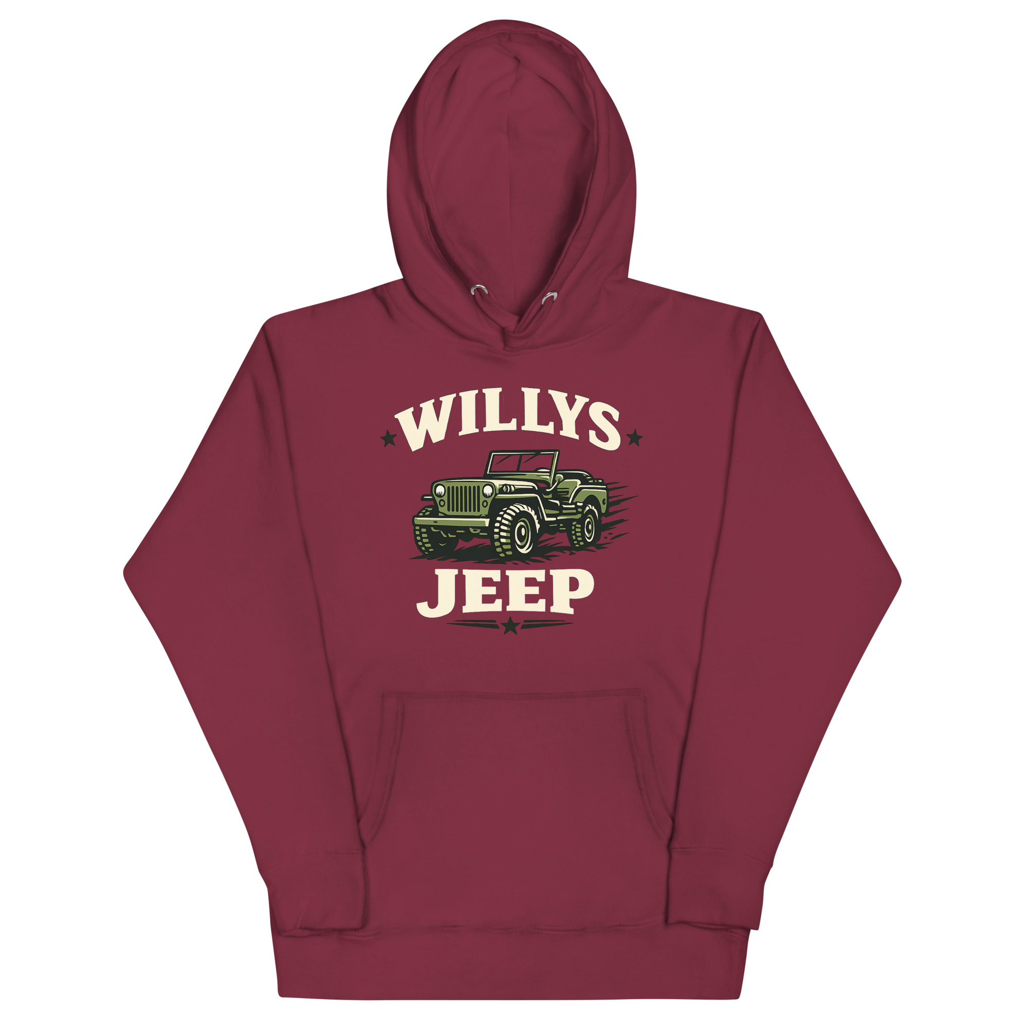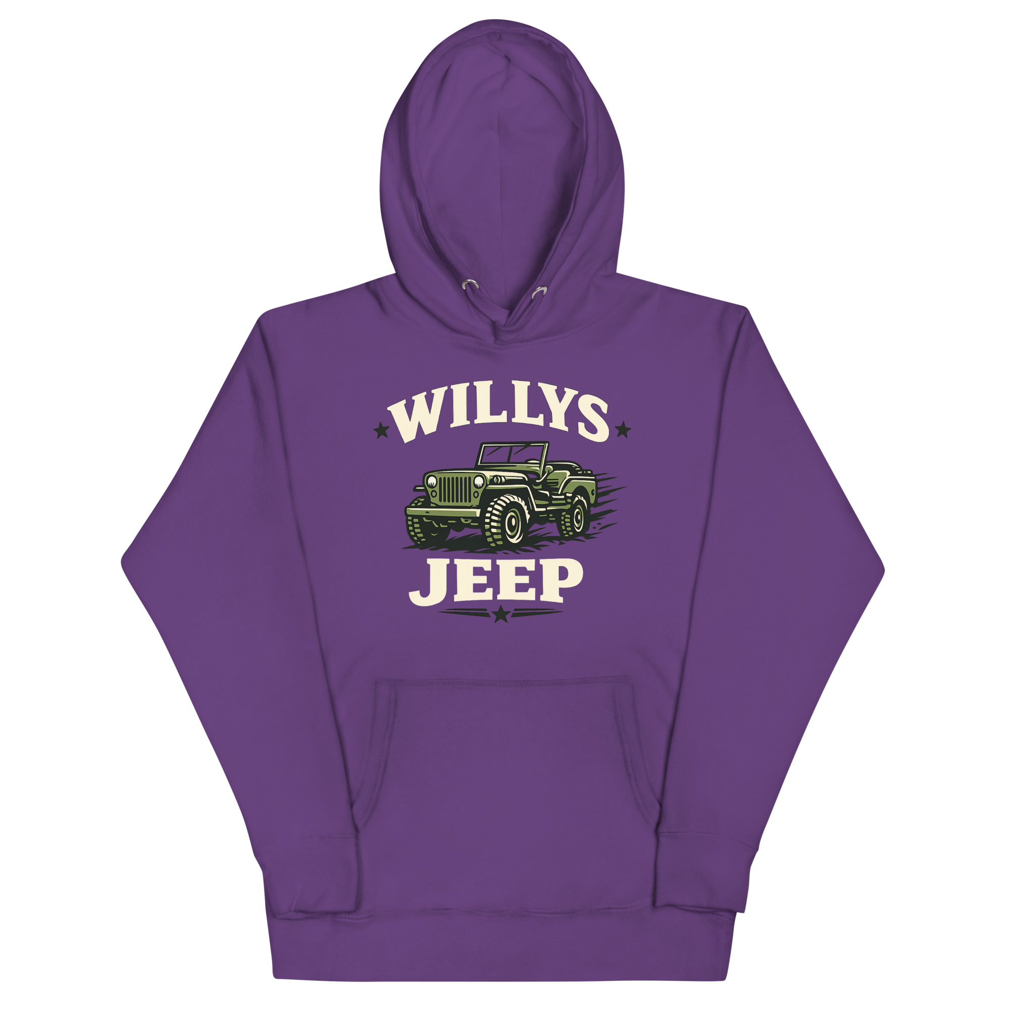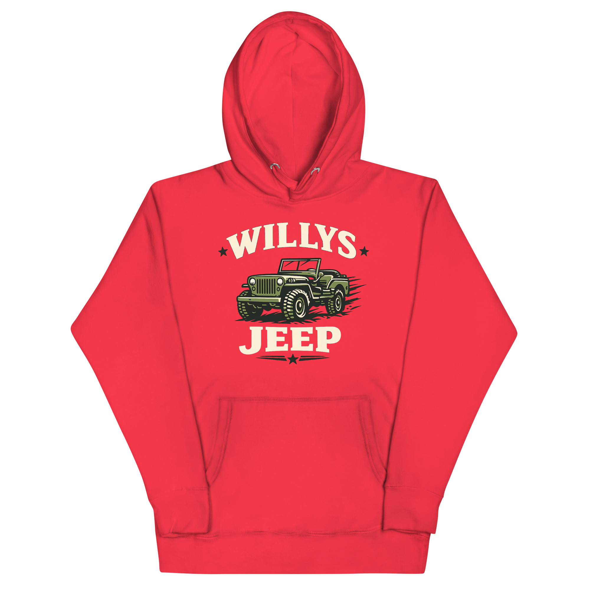 Willys Jeep Hoodie follows standard unisex sizing. For your typical fit, order your regular sweatshirt size. If you prefer a looser feel for layering—perhaps as classic car show casual attire over a collared shirt—consider going up one size.