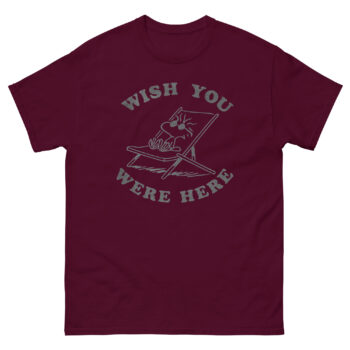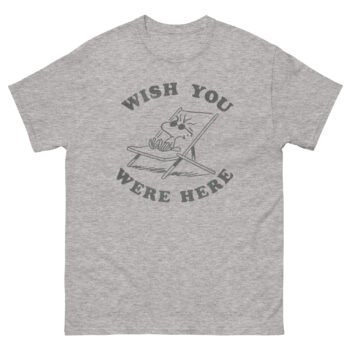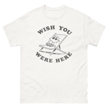 Remember the simple joy of getting a postcard? That small piece of cardstock, stamped from a far-off place, with just three words that said it all: “Wish you were here.” This “Wish You Were Here” t shirt captures that exact feeling of warm, nostalgic connection. It’s not just a retro vacation t shirt; it’s a wearable hug for anyone you miss. For fans of classic comics and easy-going style, this nostalgic design shirt brings a smile as sunny as a day at the beach.