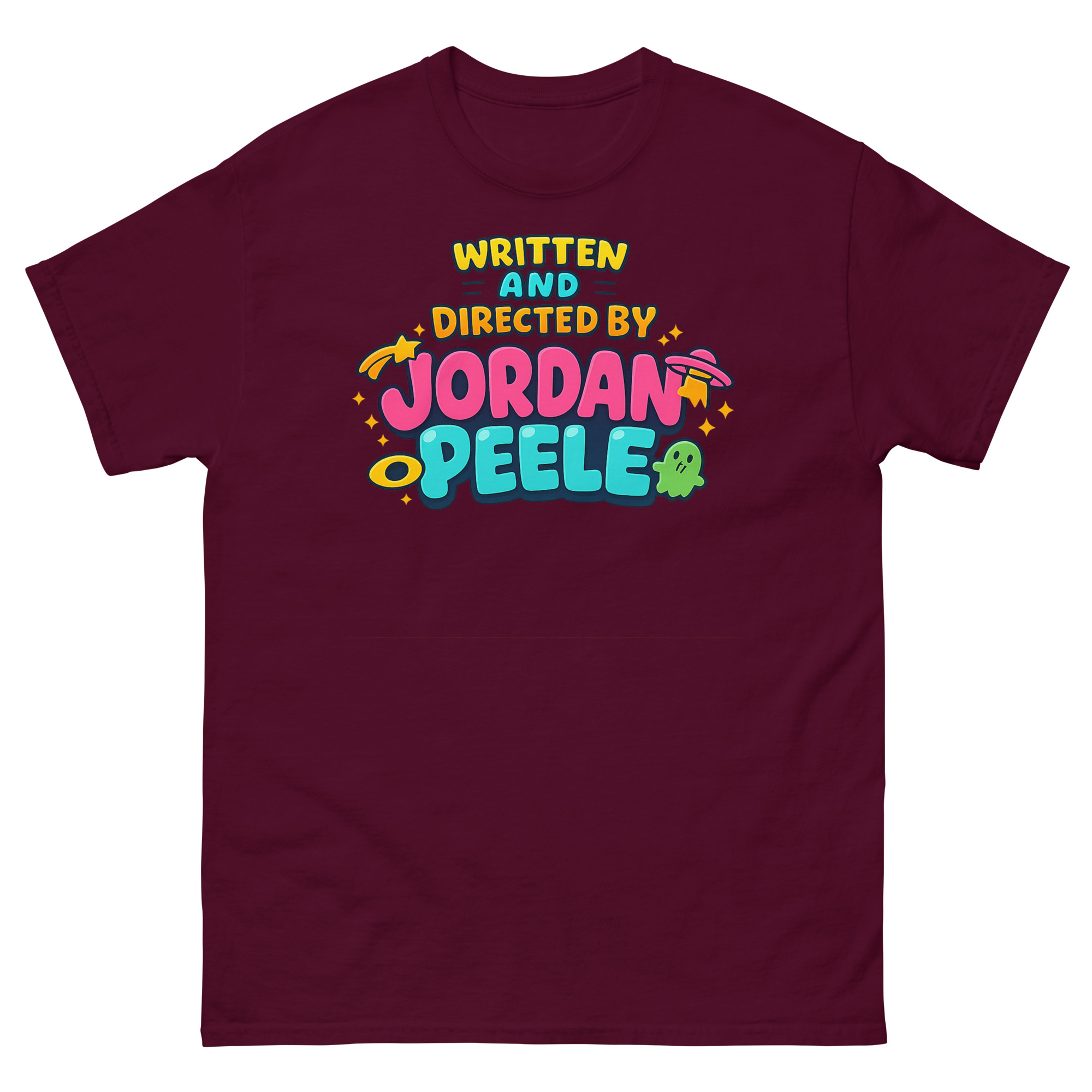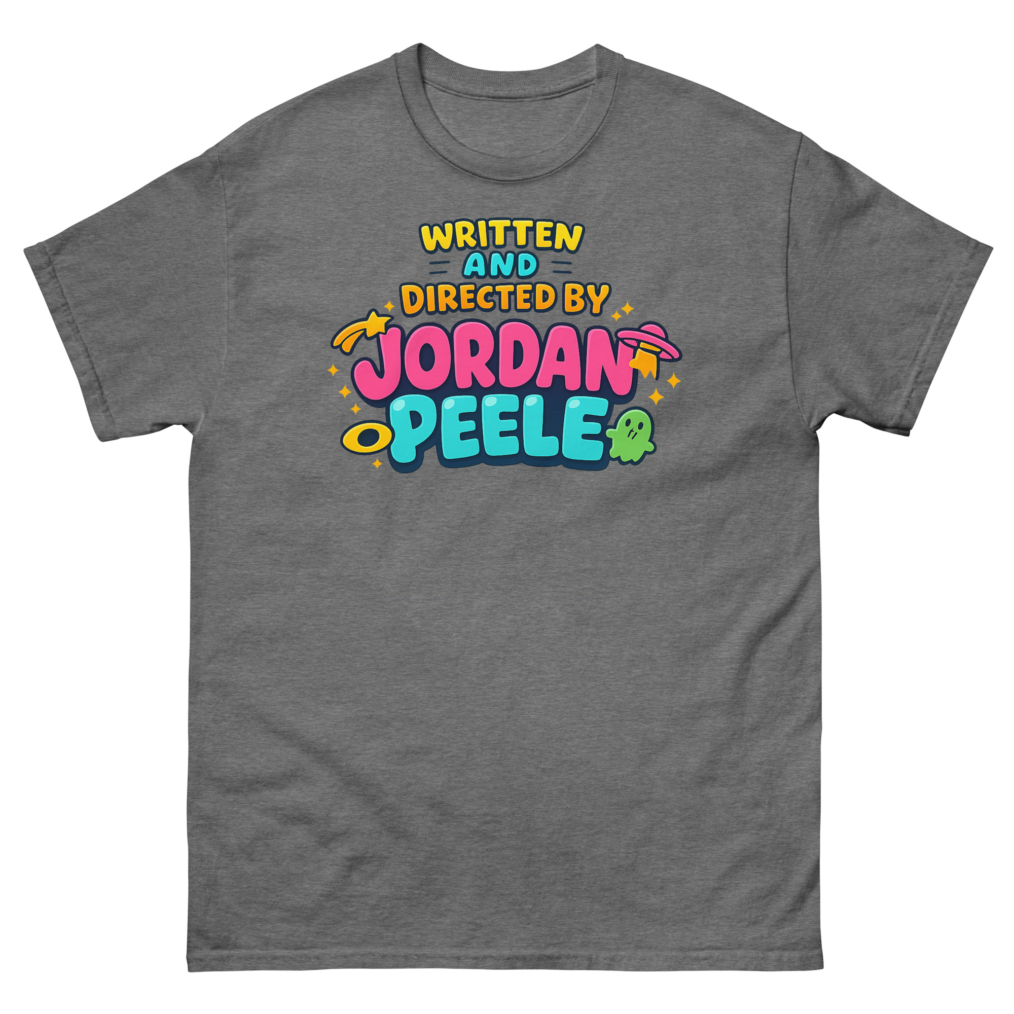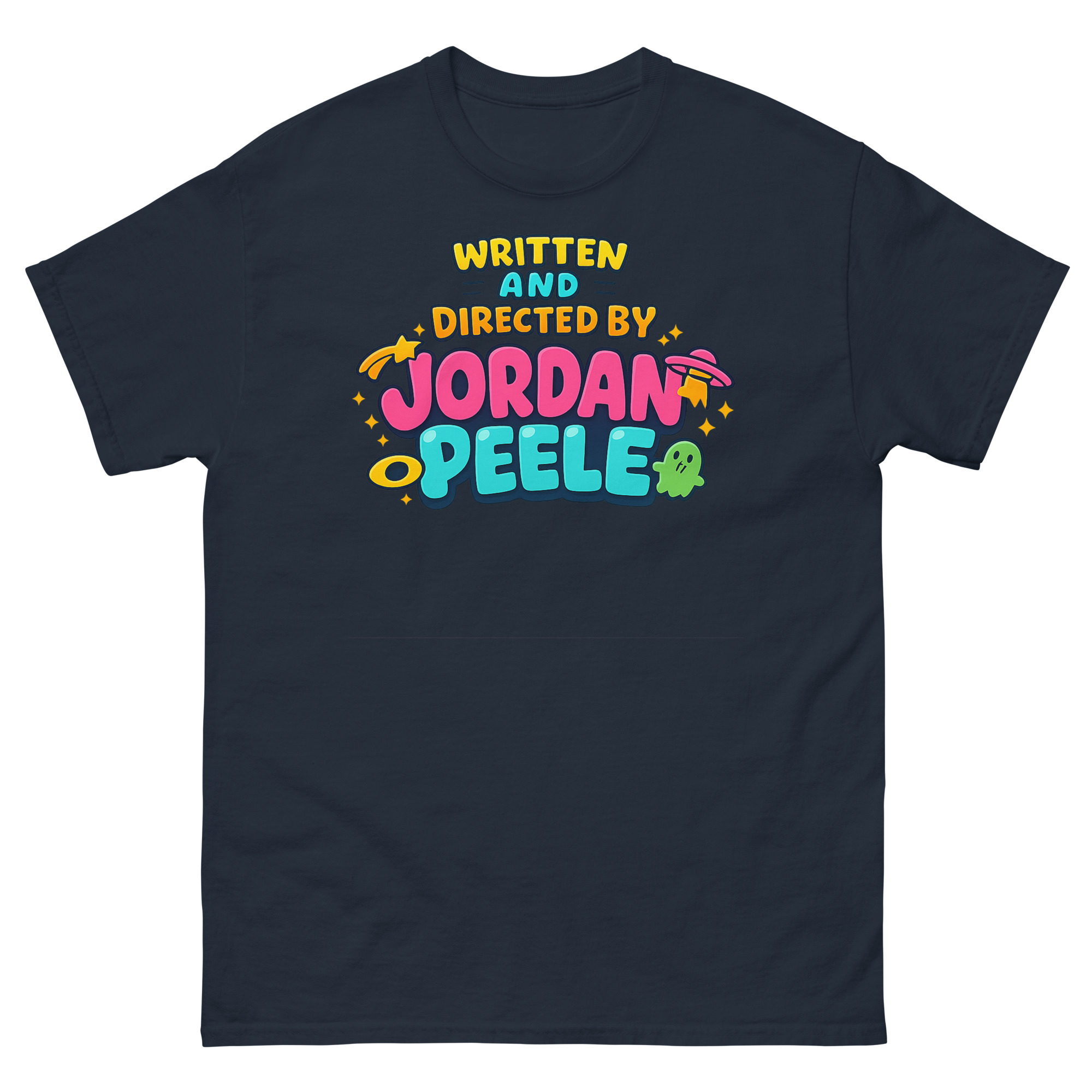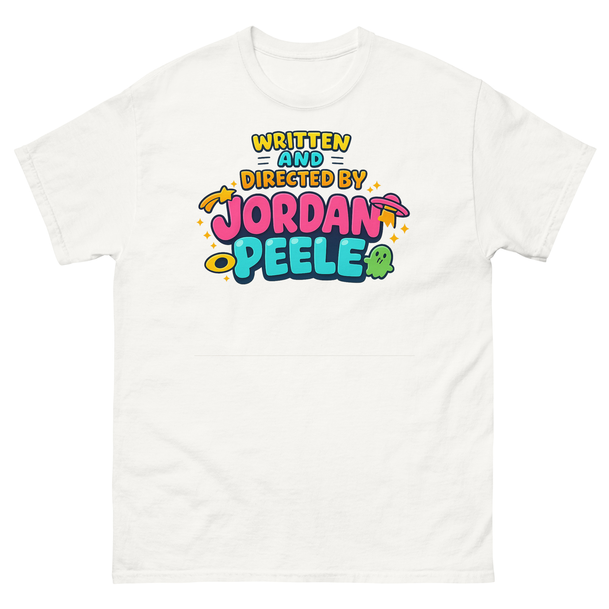 Here’s our story. We wanted to honor his filmmaker credits, but not in a dark, expected way. So we thought, why not turn Peele’s title card into a 90s cartoon classic?” The result? A brilliant juxtaposition. The phrase “WRITTEN AND DIRECTED BY JORDAN PEELE” shines in bright, friendly bubble font typography, playfully surrounded by whimsical UFOs and cute ghost icons. This Indie film aesthetic creates a conversation. It says you understand the depth of his work, but you also embrace the fun, iconic Jordan Peele aesthetic streetwear culture he’s inspired. It’s thoughtful pop culture streetwear with a wink.