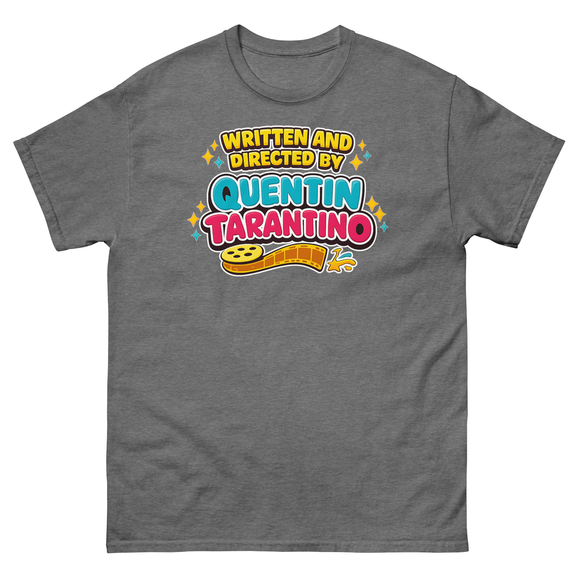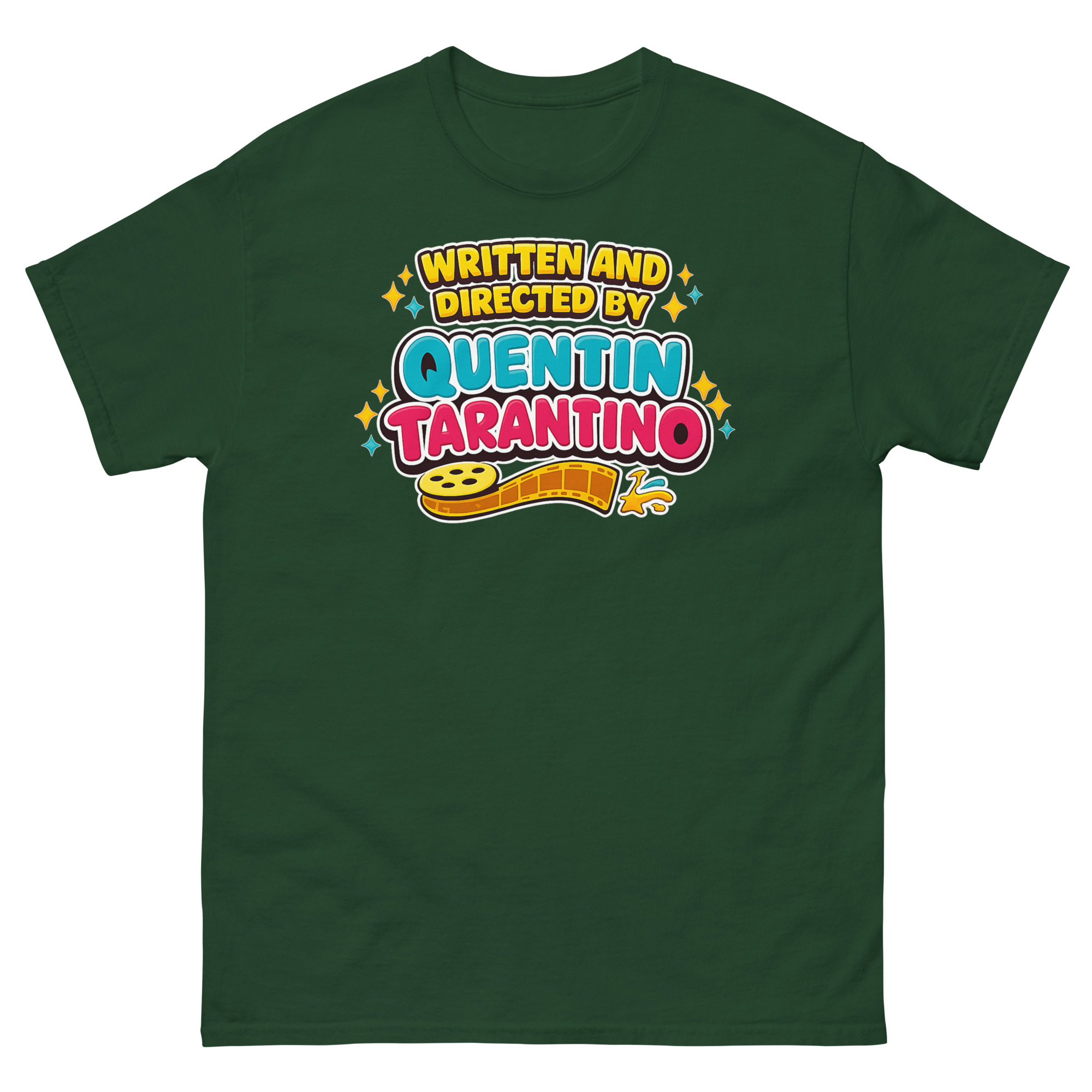 Forget dark and edgy fan merch. Instead, imagine celebrating your love for Pulp Fiction, Kill Bill, and Django Unchained with a burst of joyful color. This “Written and Directed by Quentin Tarantino” shirt isn’t just another piece of Quentin Tarantino fan merchandise; it’s a wearable piece of artistic irony. Designed for the true movie buff who appreciates an auteur’s craft but loves a clever twist, this tee reframes the Tarantino universe through a nostalgic, 90s aesthetic lens. Let’s explore why this shirt belongs in your collection.