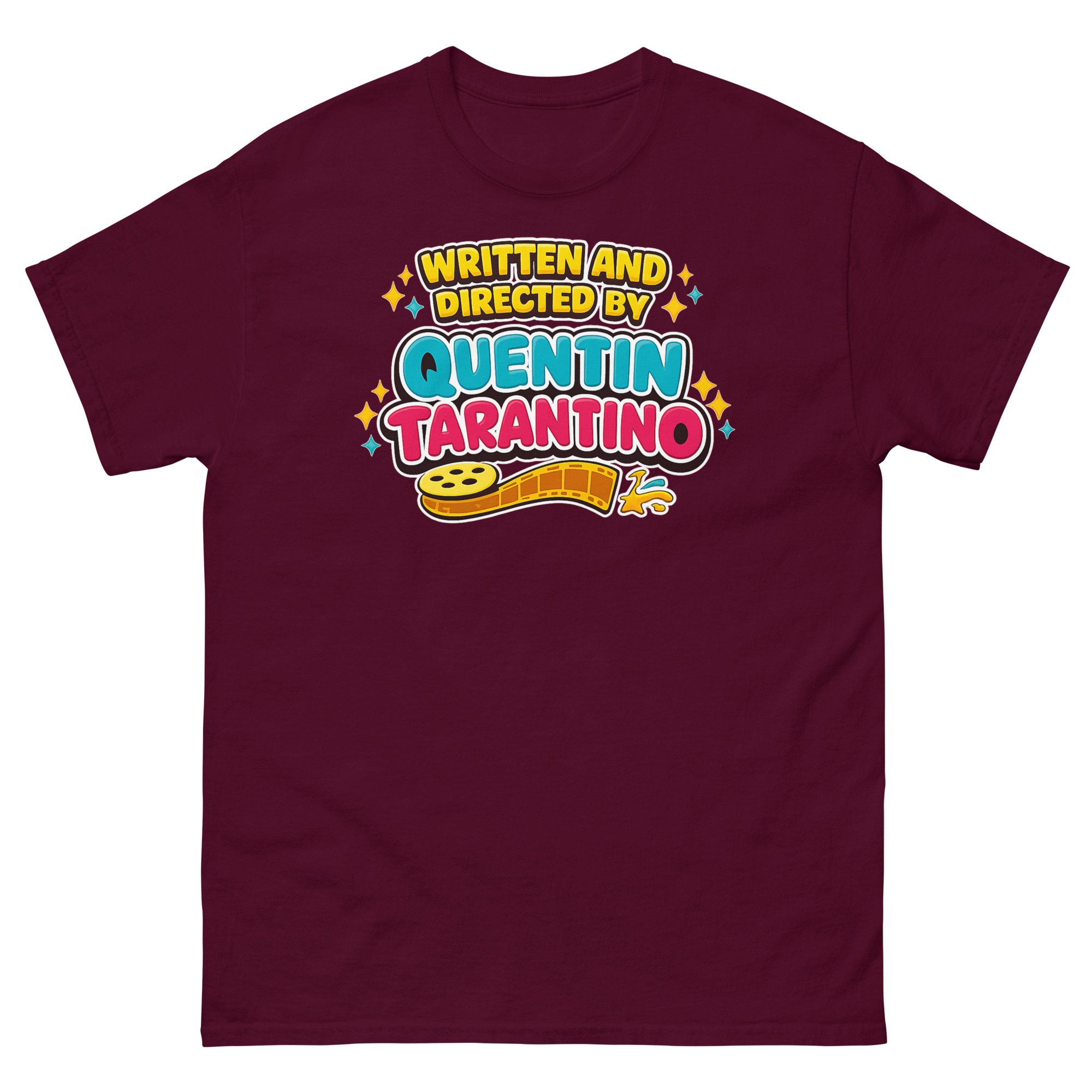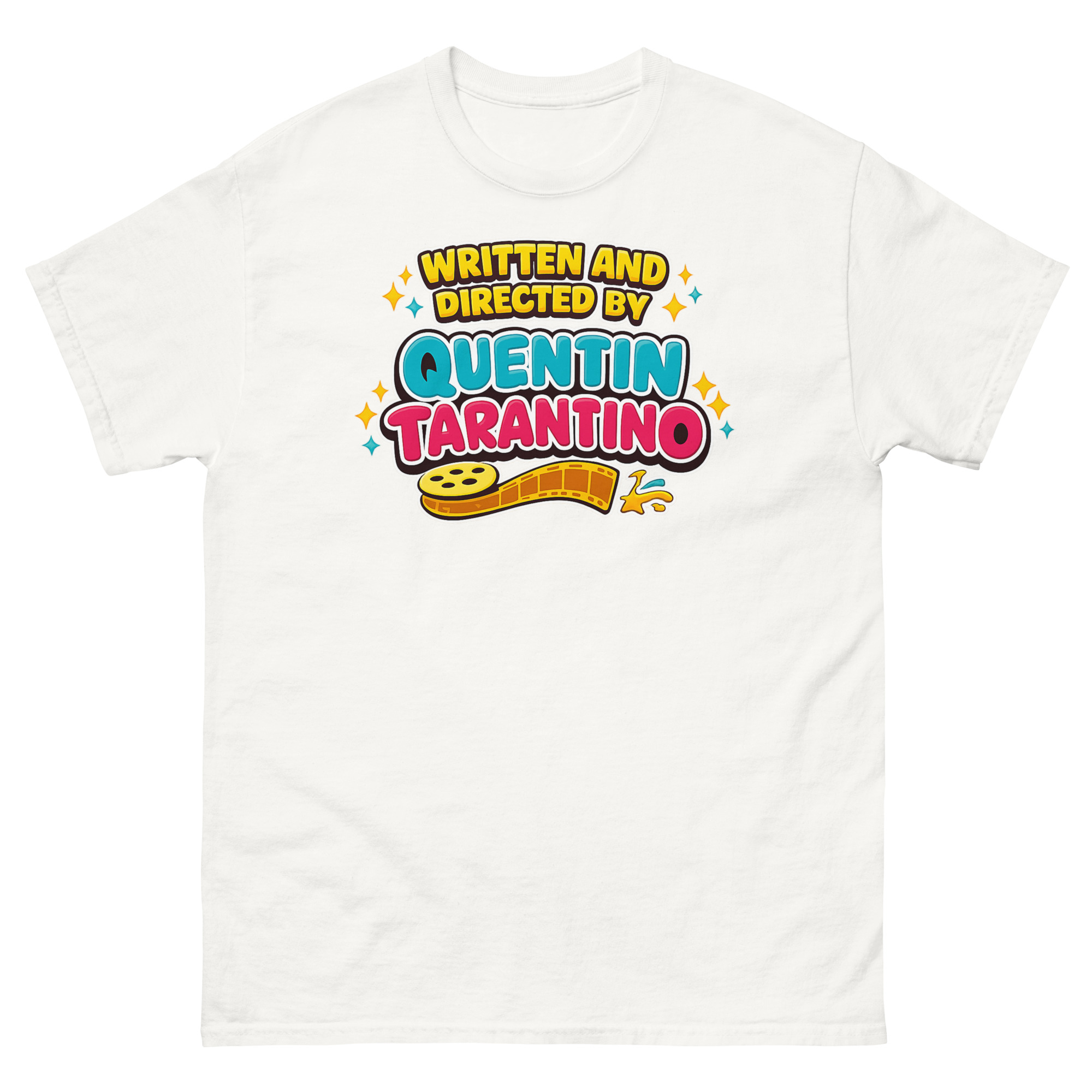 Firstly, glance at the chest. You’ll see “WRITTEN AND DIRECTED BY” arched proudly in sunny, yellow bubble letters. Following that, “QUENTIN” pops in a bold cyan, leading to the monumental, playful pink “TARANTINO.” Importantly, every letter features thick outlines and shadows, directly channeling that vibrant retro typography from 90s aesthetic movie graphic tees and classic toy boxes. Meanwhile, a golden film reel unspools below, tying the playful look back to the heart of cinema. Finally, sparkly four-point stars complete this star-studded, celebratory design.
