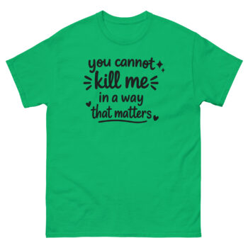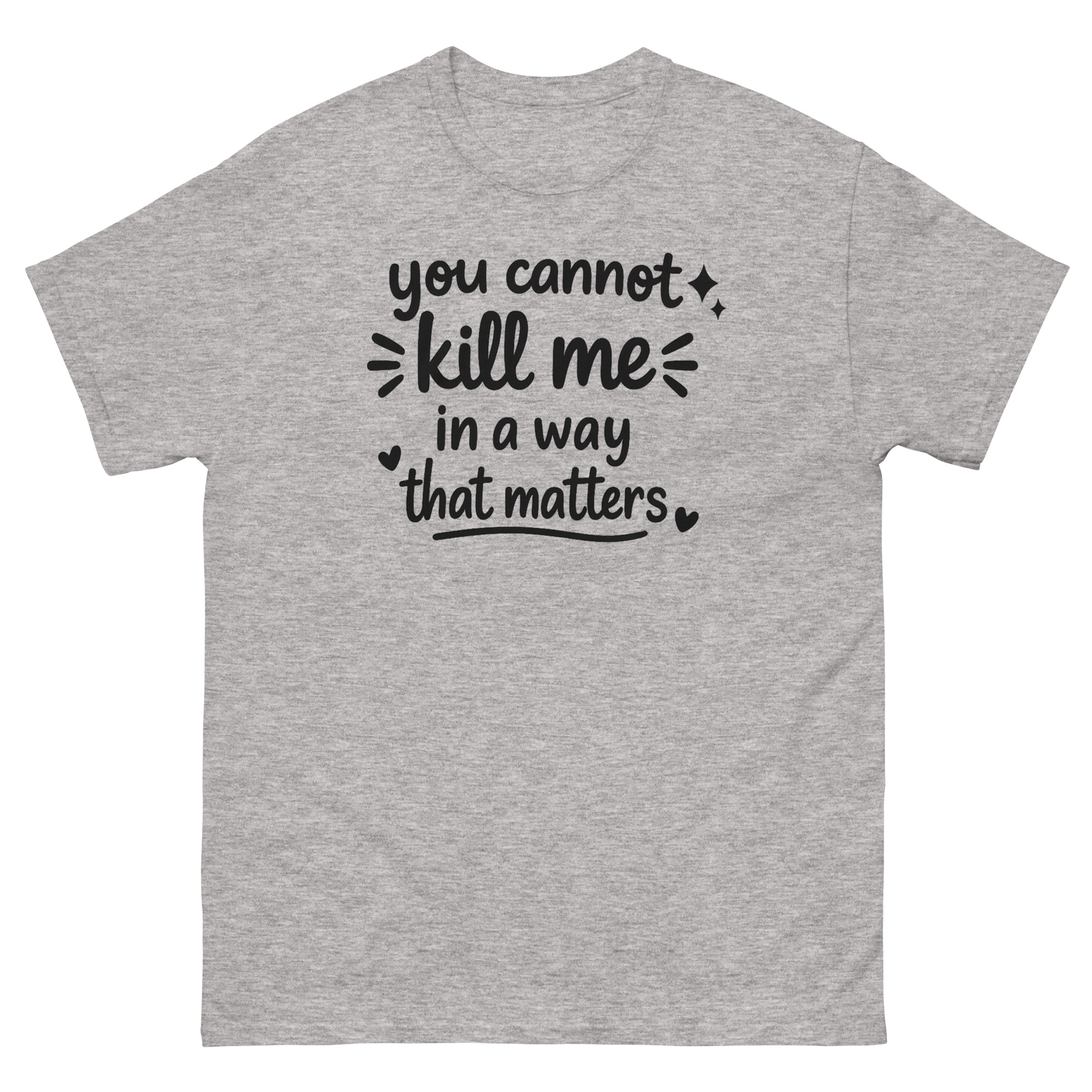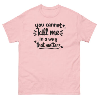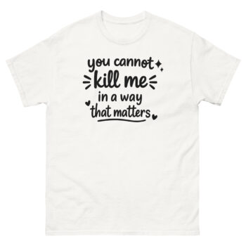 What if the most defiant statement about existence could also feel like a doodle in your favorite notebook? That’s the unique magic of our You Cannot Kill Me In A Way That Matters Shirt. Born from a viral text post about fungi and decay, this phrase has blossomed into a modern mantra of absurdist optimism. We’ve captured its essence in a playful, hand-drawn typography design that’s both deeply philosophical and disarmingly cute. For fans of Gen Z humor and Tumblr meme culture, this tee is a soft, high-quality declaration of resilience. Let’s trace its journey from a mushroom post to your wardrobe.