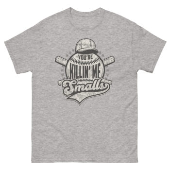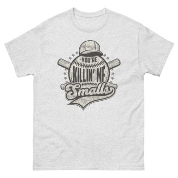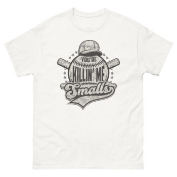 Inside the baseball, the words “YOU’RE KILLIN’ ME” are printed in bold, classic lettering. Below it, the word “Smalls” flows in a stylish script font. This retro 90s baseball tee for fans uses a simple black, white, and gray color scheme that feels timeless, like a well-loved jersey from a championship season. The overall effect is clean, balanced, and instantly recognizable.