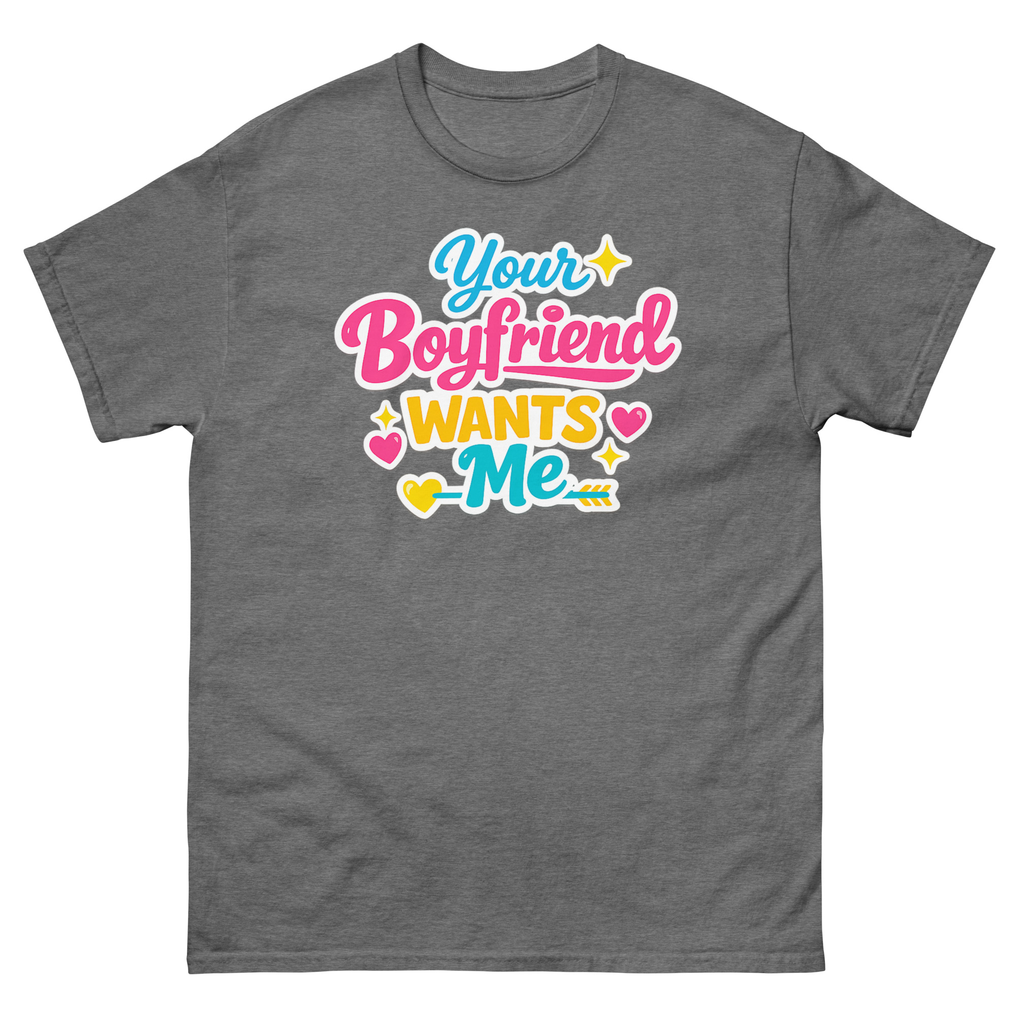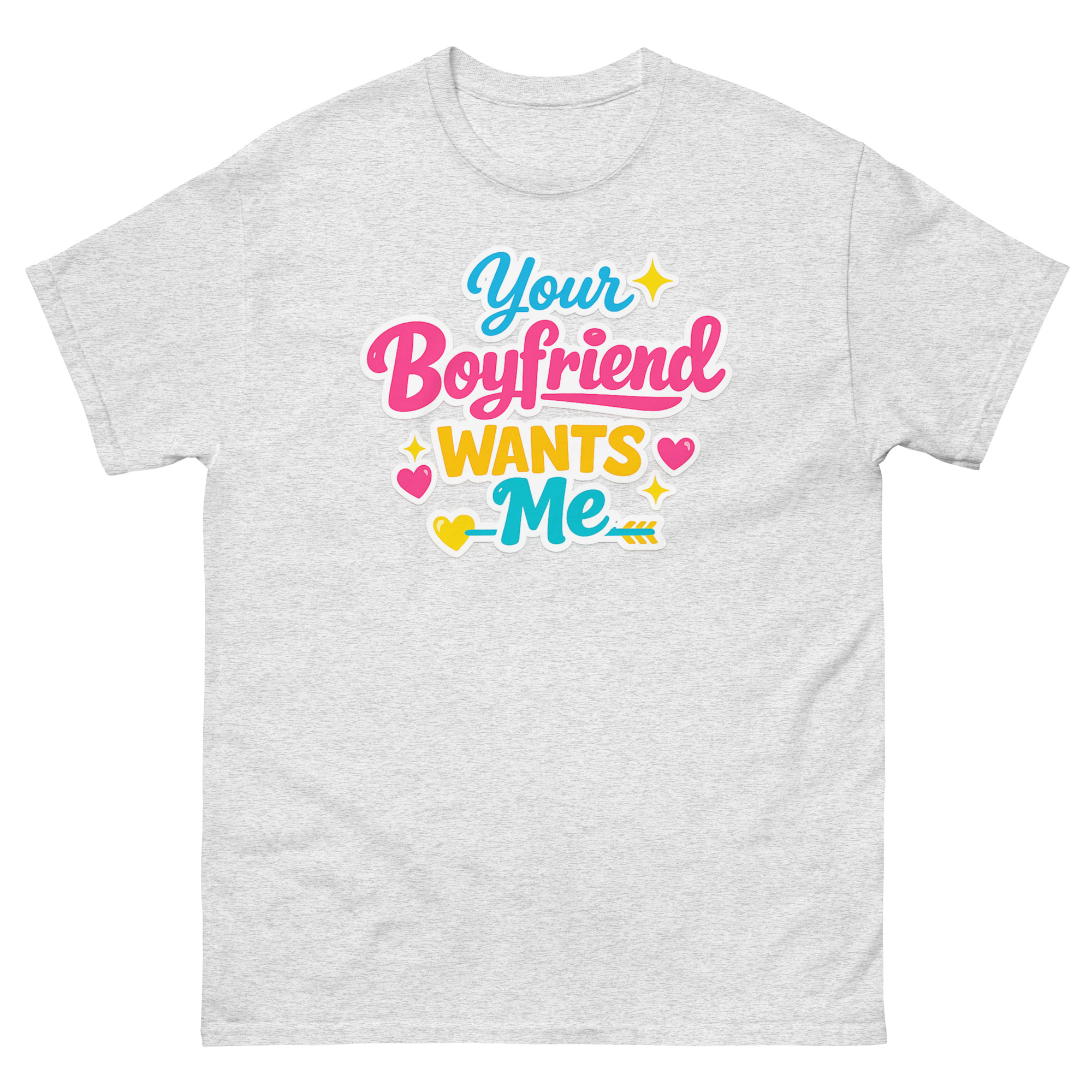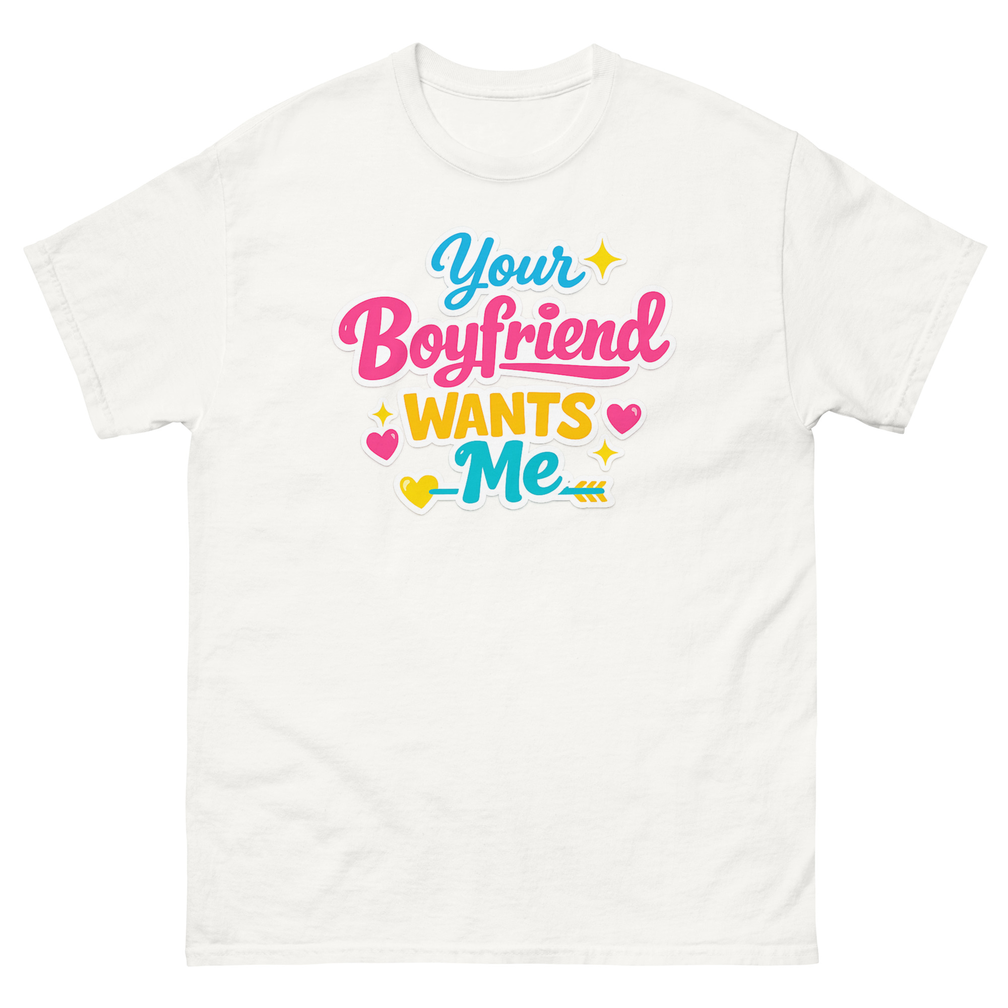 We wanted to create Your Boyfriend Wants Me T Shirt that was confident, not confrontational. The design draws inspiration from the fun, exaggerated aesthetics of early 2000s pop culture, think bold colors and playful graphics. The phrase itself is printed in a mix of bubbly cursive and chunky block letters, all outlined to look like a collection of stickers.