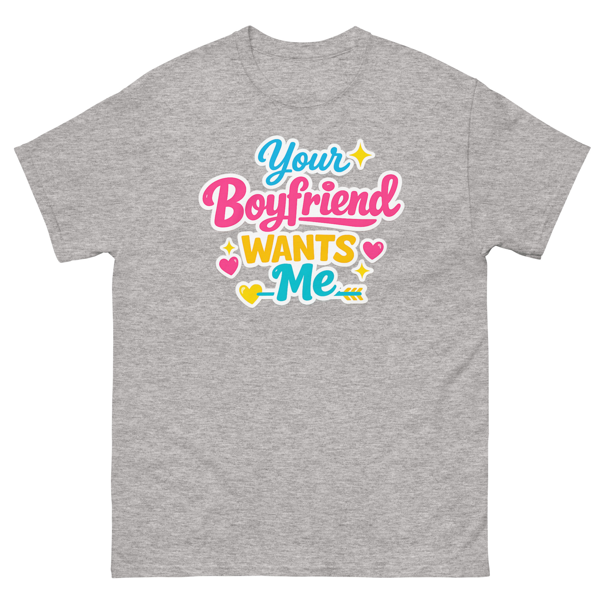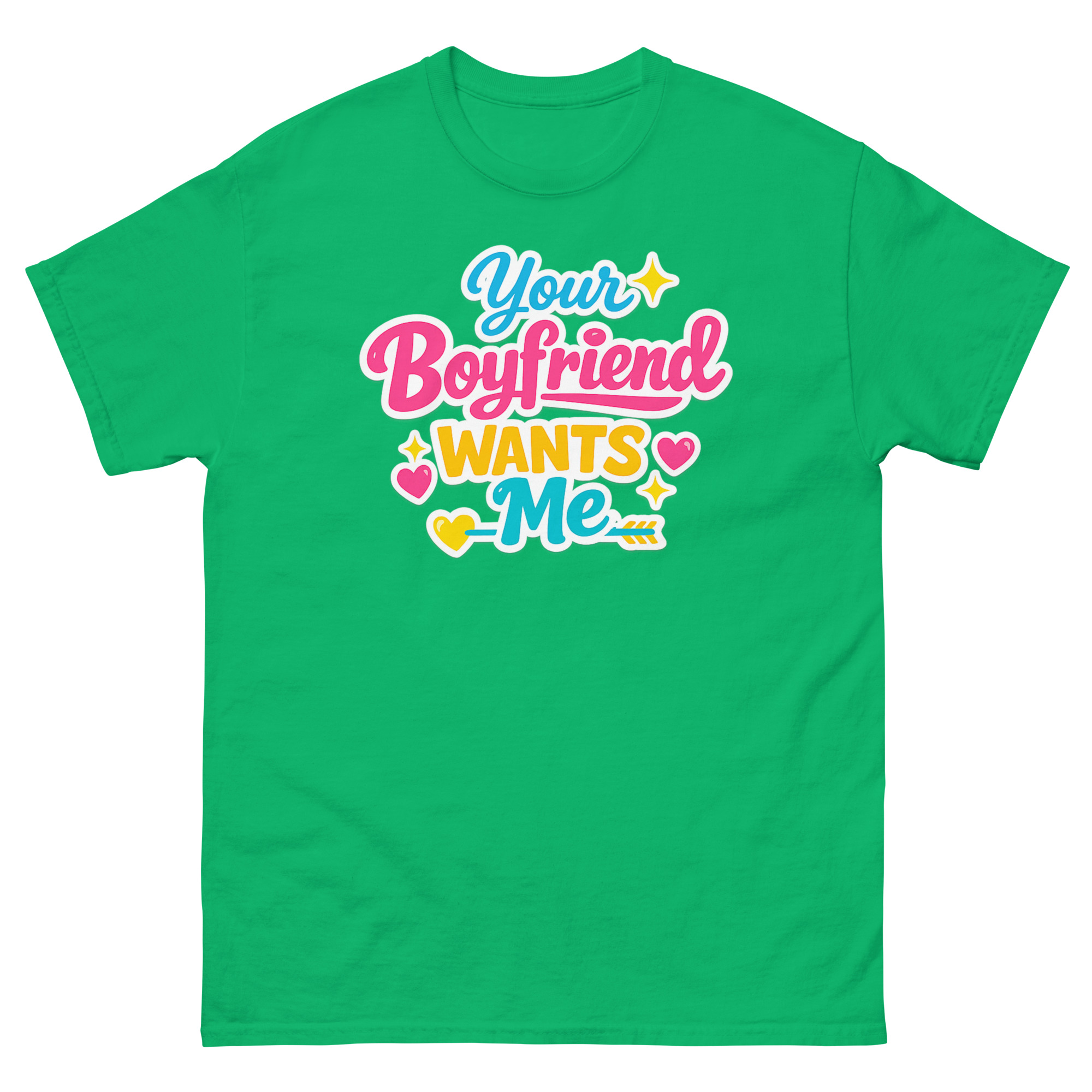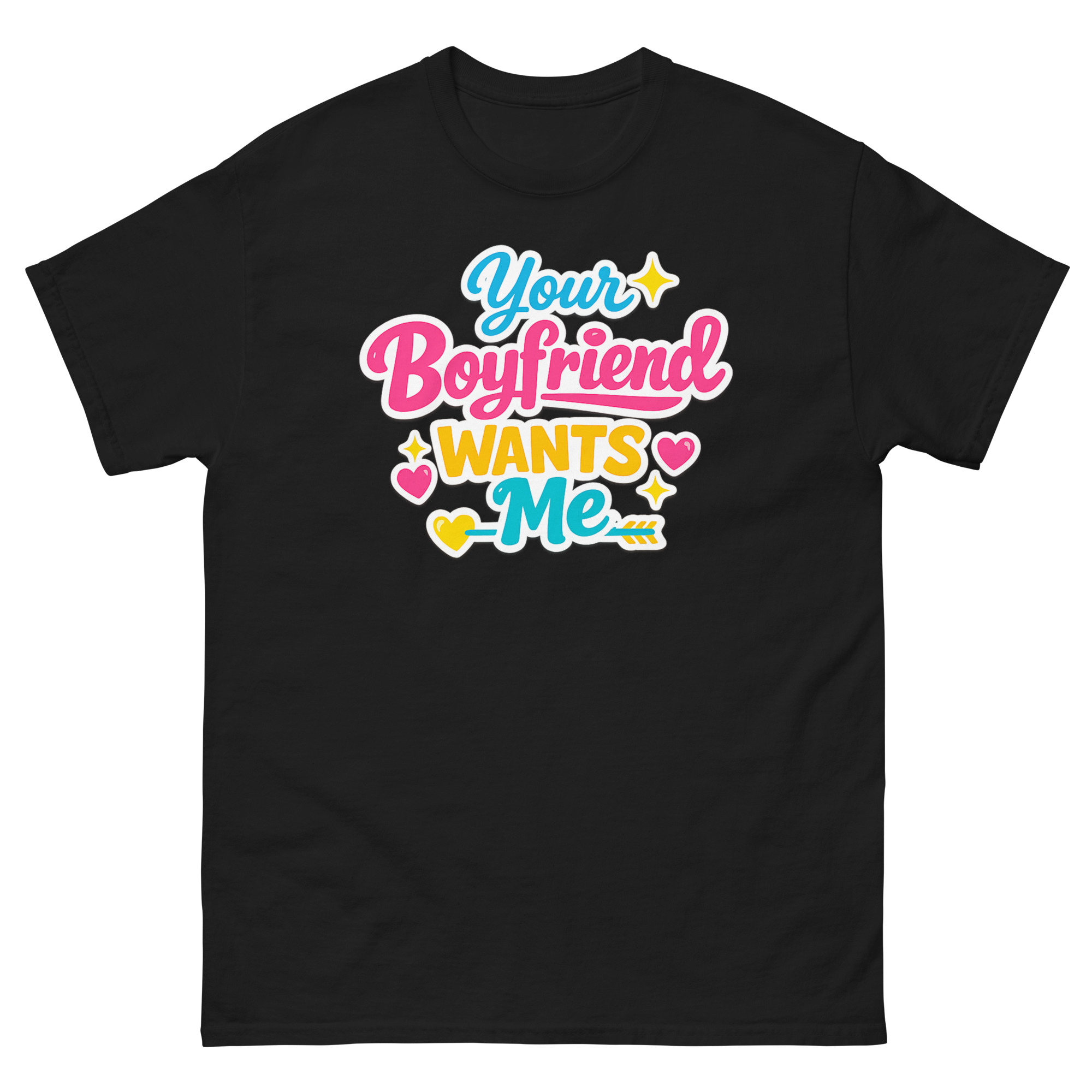 The Your Boyfriend Wants Me T Shirt is a bold cotton tee featuring a playful, vibrant graphic. Its unique Y2K-inspired sticker-style design combines bubbly fonts with bright colors for maximum impact. This shirt is designed for anyone with a confident, humorous edge, making it an ideal sassy birthday gift for a confident best friend or a standout piece for a Y2K themed party outfit.
