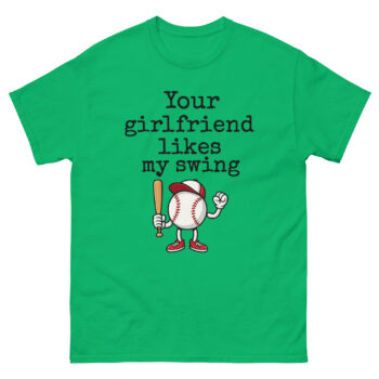 Don’t just watch from the sidelines, step into the spotlight with the ultimate piece of sports humor. The Your Girlfriend Likes My Swing Shirt is more than cotton; it’s a trophy for your witty, confident spirit. Perfect as a gag gift for baseball boyfriend, a team morale booster, or a treat for yourself, this tee is your ticket to winning the style game.