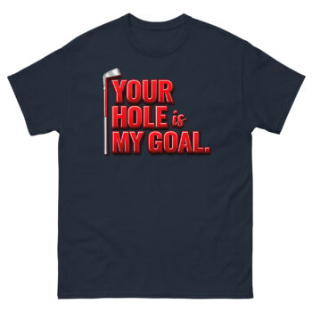 The design is all about high-impact visuals. The words “YOUR HOLE” and “MY GOAL” are in a heavy, gradient-red block font with a 3D effect that makes them pop. A sleek, chrome golf iron runs vertically along the side, clearly tying the joke to the sport. The clean, modern layout ensures the suggestive golfing slogan is the undeniable focal point. This crude golf joke apparel is made for the confident player who values fun as much as a good swing.