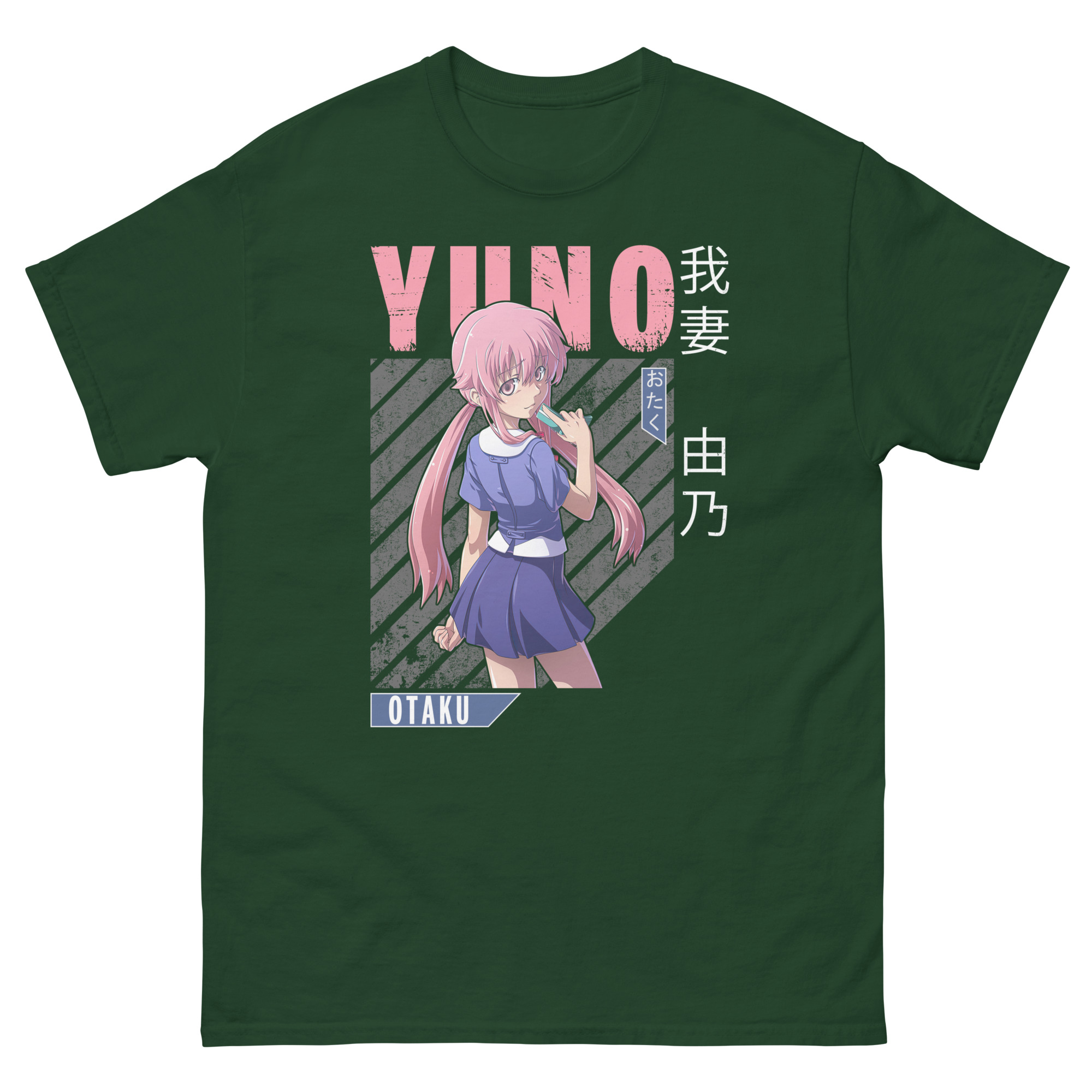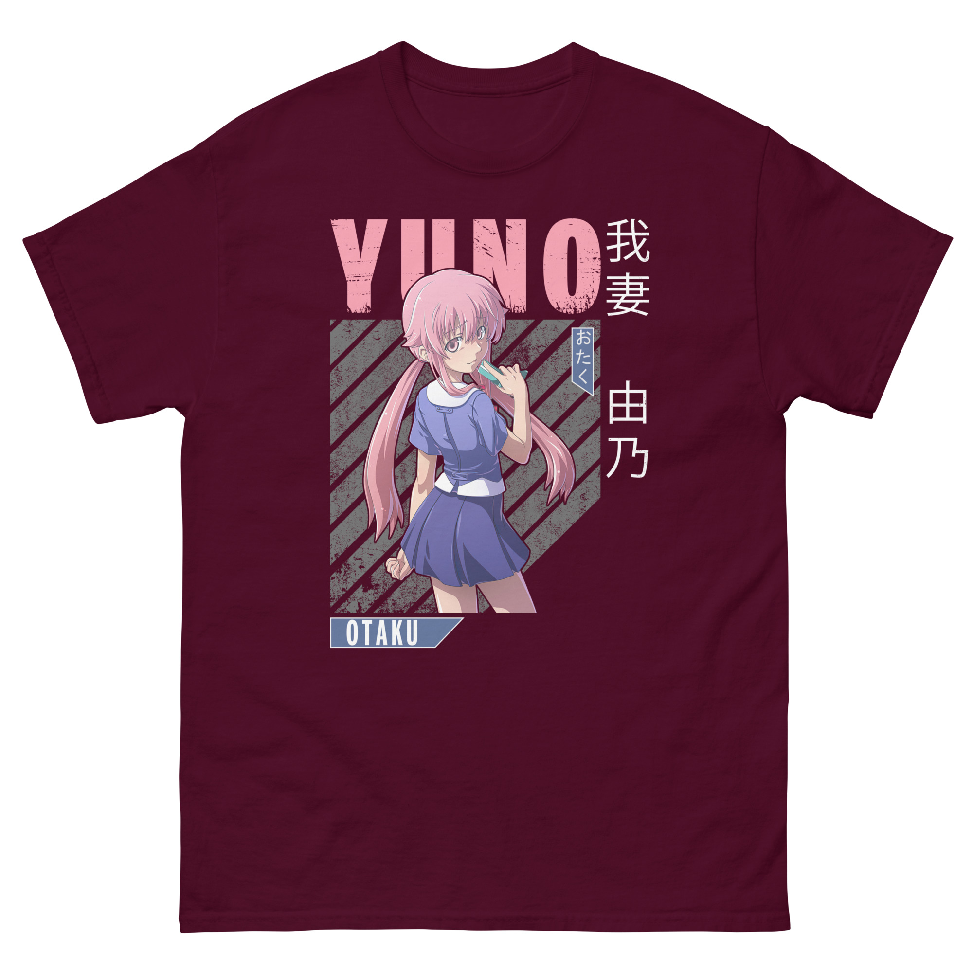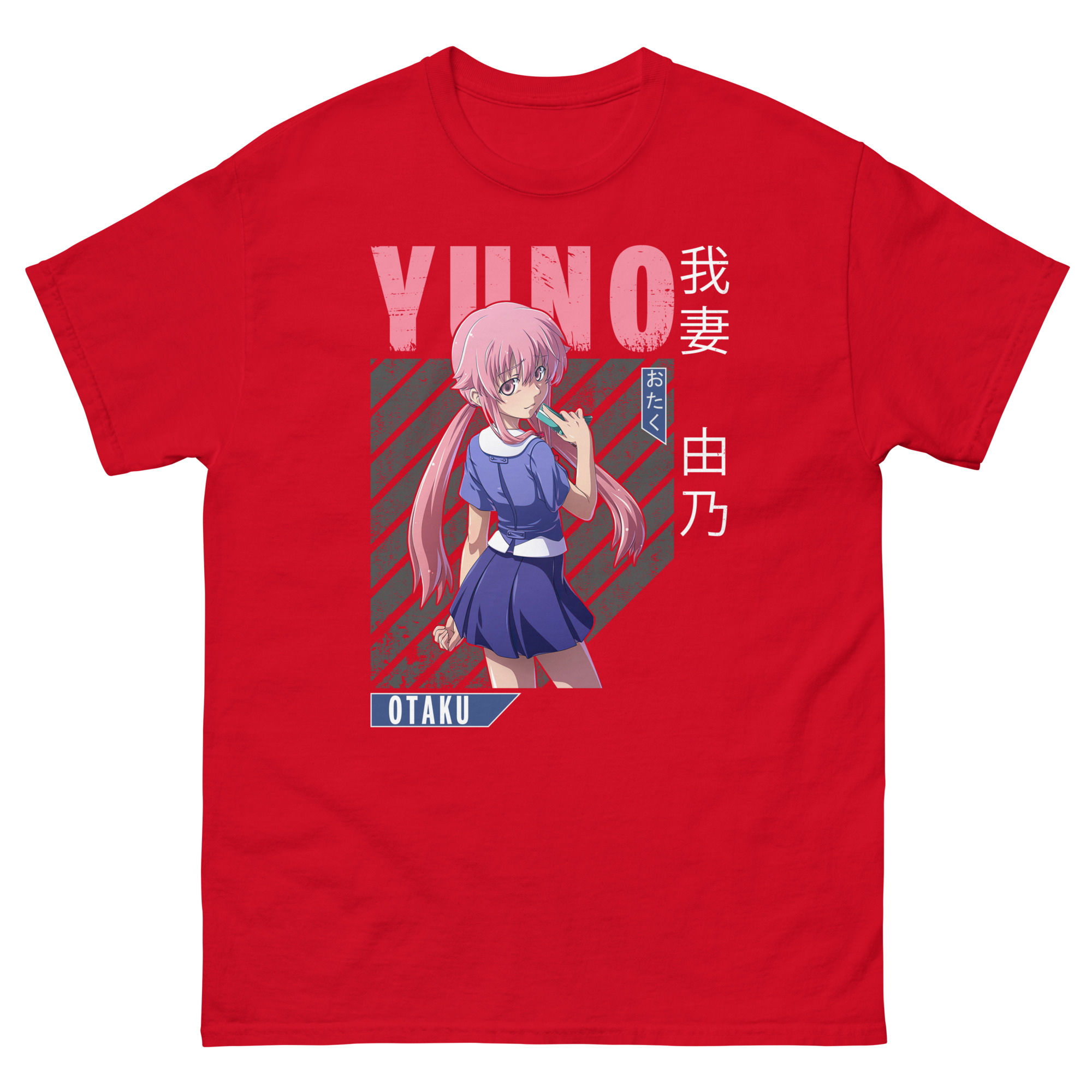 Consequently, every detail in this Japanese anime art shirt is intentional. Her forward-leaning pose? That’s her relentless drive to protect Yukiteru. The bold, pink “YUNO” text screams her dominance, while the authentic Japanese kanji for her name grounds the design in its original culture. Even the subtle “Otaku” tag is a proud badge for the community. This shirt is a love letter to Mirai Nikki character art inspiration, transforming a classic scene into a modern fashion piece.